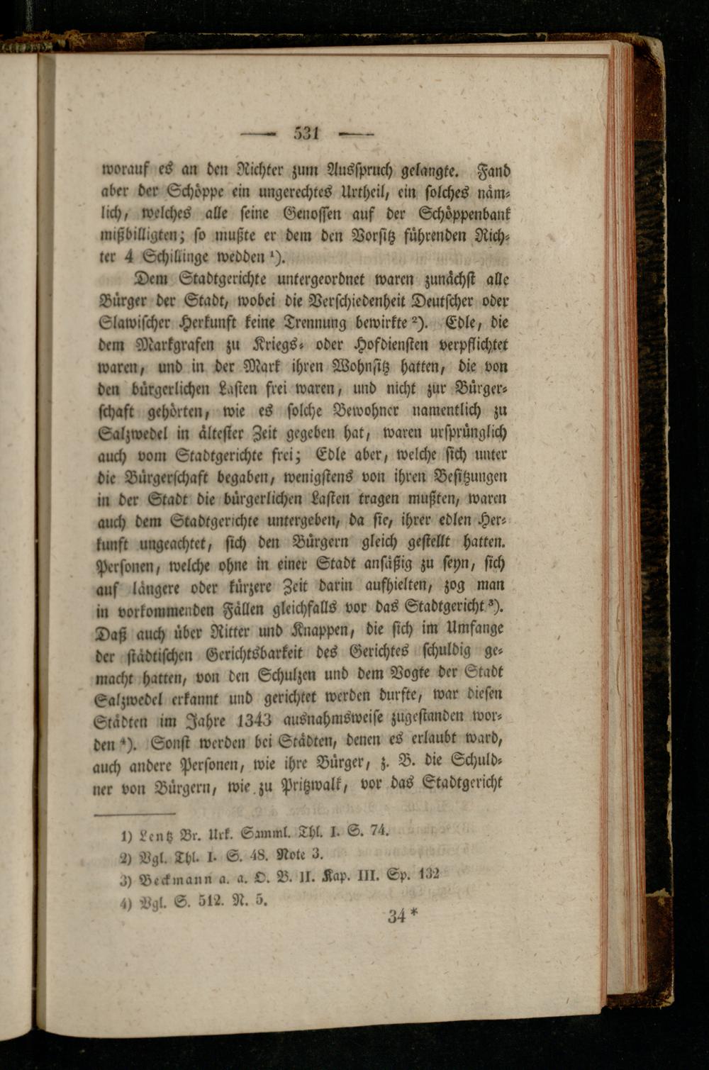 Dem Stadtgerichte untergeordnet waren zunächst alle Bürger der Stadt, wobei die Verschiedenheit Deutscher oder Slawischer Herkunft keine Trennung bewirkte^). Edle, die dem Markgrafen zu Kriegs, oder Hofdienstcn verpflichtet waren, und in der Mark ihren Wohnsitz hatten, die von den bürgerlichen Lasten frei waren, und nicht zur Bürgerschaft gehörten, wie es solche Bewohner namentlich zu Ealzwedrl in ältester Zeit gegeben hat, waren ursprünglich auch vom Stadtgerichte frei; Edle aber, welche sich unter die Bürgerschaft begaben, wenigstens von ihren Besitzungen in der Stadt die bürgerlichen Lasten tragen mußten, waren auch dem Stadtgerichte untergeben, da sie, ihrer edlen Herkunft ungeachtet, sich den Bürgern gleich gestellt hatten. Personen, welche ohne in einer Stadt anfäßig zu seyn, sich auf längere oder kürzere Zeit darin aufhielten, zog man in vorkommenden Fällen gleichfalls vor das Stadtgericht ^). Daß auch über Ritter und Knappen, die sich im Umfange der städtischen Gerichtsbarkeit des Gerichtes schuldig gemacht hatten, von den Schulzen und dem Vogte der Stabt Eakzwedcl erkannt und gerichtet werden durfte, war diesen Städten im Jahre 1343 ausnahmsweise zugestanden worden *). Sonst werden bei Städten, denen es erlaubt ward, auch andere Personen, wie ihre Bürger, z. B. die Schuldner von Bürgern, wie. zu Pritzwalk, vor das Stadtgericht