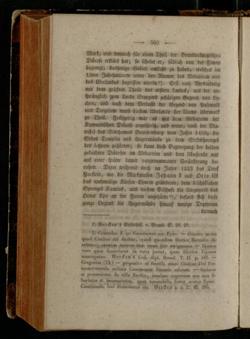 Mart, dennech für eine« Theil der Branden borg,scheu Di-crf« erklärt har; fv fthemr er, südlich von der tziaew begrenzt, daSzang« Gebiet umfaßt ;« haben, welches im 13ten Jahrhunderte unter den Namen Altdarnim und drS UkerlandeS begriffen wurde'). Erst nach Verbindung mit de« größten Theür b«S erste n , Landes, mit der ,n« ft>rünglich pim Lande Ctargarb gehörigen Gegend, von kn» chen, und nach dem Verluste der Gegend von Pasrwalk und Torgelo» warb tiest» Ukerlande der Rom« Ukermark zu Theil. Frühgeitig war «S mit dem «lrbarnim der Kamminfthm Diicef, anqeh-rig, und wenn, nach der Ma> trikel des B'SchumeS Brandenburg vom Jahre 1450, die SrdeS Templia und Angermünde zu dem St-fksfprengel deS letzten, gehörten; so kann diest Begrenzung der beiden gedachten D>öcesen im Alrbarnim und dem Ukerland« nur auf einer später damit vorqenowmenen Veränderung be» ruhen. Denn während noch i« Jahre 12ZZ baS Dorf Parstein, wo bi« Markgraf«, Johann l uud Otto lll daS nachmalige Kloster tzdarin grünbekm, dem bischöflichen Sprengel Kamin-, und diesem Bischöfe die Umgegmd d«S Ortes kipc an der Amow angehörte'), brfand fich diese ganze Gegend bis Stziger münde hinauf wenig« Dezennien