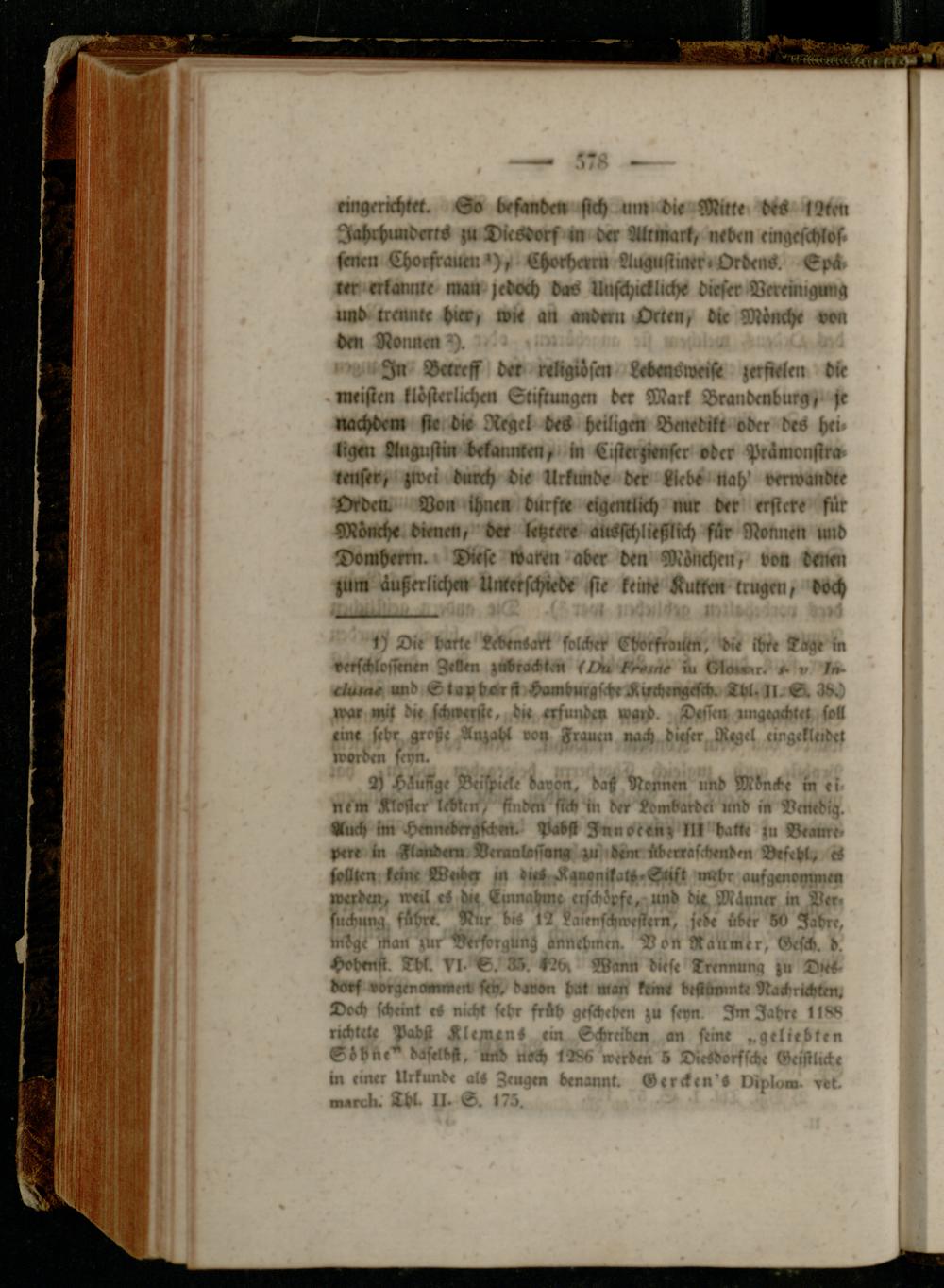 In Betreff der nrligiösm L«b«o weift zerfielen die .meisten klösterlich« Stiftungen der Mark Brandenburg, ft nachdem fte di» Regel des heilig« Benedikt oder des hei. liqen August« bekannten, in Cisterftenftr »der PrLmonstr«. lenser, zwei durch die Urkunde der -leb» «ah' verwandte Oed«. Von ihn« darf« eigentlich nur der erster« für Mönch« dienen, der letztere alÄschließlich für Normen und Domherrn.» Dieft «Vawn aber den Mönchen, voa den« zum äußerlich« Unterschiede He kein« Kult« trug«, doch