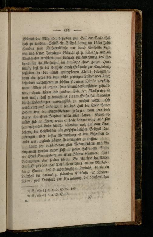 Unter dm verschiedenartigsten Nebenabsichten und Bedingungen wurden daher fass in jedem Jahre alle Stifter der Mark Brandenburg an ihren Gütern vermehrt. Jene Bedinguugen aber fehlten selten. So restgnirte der Burg- Graf Eigfried das Dorf Reinoldsiorf an die Markgrafen zu Gunsten des Brandenburgfchen Kapitels, damit ein Drittheil der daraus zu ziehenden Einkünfte für Kirchen- Lichter, zwei Dritcheile zur Vermehrung der domherrlichen