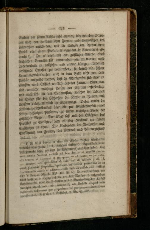 ^uchrn vor seinen Richkerstuhl gezogen, hier von den Schöppen nach den herkömmlichen Formen und Grundsätzen des randrechres entschieden, und die Urcheile der letztem vom Probst oder einem Prokurator desselben in Anwendung ge. drachr'). Da es aber mit der geistlichen Würde eines kirchlichen Beamten sur unvereinbar gehalten wurde, auch rvdesurthcile zu vollziehen und andere blutige, körperlich verletzende Strafen zu vollstrecken, so konnte die höhere Knminalgenchtsbarkeit auch in dem Falle nicht von dem Probste ausgeübt werden, daß die Markgrafen sich ihrer zu Gunsten eines Stiftes wirklich begeben hatten. Hiezu war «ine weltliche mächtige Person den Stiftern erforderlich, and natürlich dir am Geeignetsten, welcher im klebrigen die Sorge für die Sicherheit der Kirche im Innern und Aeußern oblag, nämlich ihr Gchirmvogt. Daher wurde die Krimmalgerichtsbarkeit über die zur Gerichtsbarkeit einer Kirche gehörigen Personen, zu einem wichtigen Lheile der geistlichen Vogtei. Der Vogt saß mit den Schöppen des Probstes zu Gerichte, hatte es aber durchaus mit keinen Civilsachcn zu thun. Die Verbrechen der Nochjucht und Entführung von Frauen, des Mordes und Blutvergießens . ...—— "