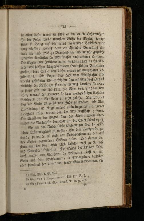 allen diesen wäre,! sie selbst anfänglich die Schirmvögke. In der- Folge wurde manchem Stifte die Vogtei, wenig, siens in Bezug auf die damit verbundene Gerichtsbarkeit ganz erlassen; worauf dann ein ähnliches Verhalkniß eintrat, wie nach 1238 zu Brandenburg, und manche geistliche Vogtei,n überließen die Markgrafen auch anderen Personen. Die Vogtei über Jerichow hatten sie schon 1172 an Lehnsin. -aber des hiesigen Magdeburgschen Schlosses zur Vergeltung großer, dem Stifte von diesen erwiesener Wohlthaten abgetreten'). Die Vogtei über das vom Markgrafen Al- brecht gestifteten Kloster Leihkau überließ Markgraf Otto! vielleicht der Kirche zur freien Verfügung darüber; sie ward zu seiner Zeit und bis 1211 von Edlen von Lindow versehen, worauf der Konvent sie dem markgräflichen Vasallen Gebhard von Arnstein zu Lehn gab^). Die Vogkeien über die Kirche Simonis und Juda zu Goslar, die Abtei Quedlinburg und einige andere auswärtige Stifter wurden gleichfalls frühe wieder von der Markgrafschaft getrennt. Die Ausübung der Vogtei über das Kloster Chorin übertrugen die Markgrafen dem Schulzen der Stadt Oderbcrg -).