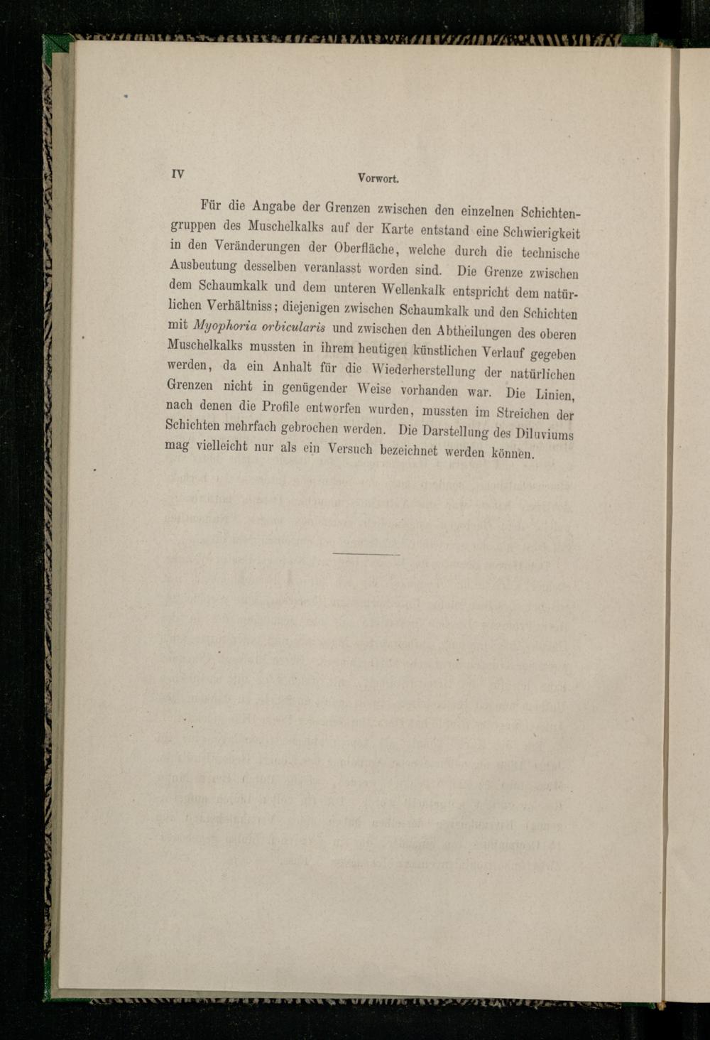 Für die Angabe der Grenzen zwischen den einzelnen Schichtengruppen des Muschelkalks auf der Karte entstand-eine Schwierigkeit in den Veränderungen der Oberfläche, welche durch die technische Ausbeutung desselben veranlasst worden sind. Die Grenze zwischen dem Schaumkalk und dem unteren Wellenkalk entspricht dem natürlichen Verhältniss; diejenigen zwischen Schaumkalk und den Schichten mit Myophoria orbicularis und zwischen den Abtheilungen des oberen Muschelkalks mussten in ihrem heutigen künstlichen Verlauf gegeben werden, da ein Anhalt für die Wiederherstellung der natürlichen Grenzen nicht in genügender Weise vorhanden war. Die Linien, nach denen die Profile entworfen wurden, mussten im Streichen der Schichten mehrfach gebrochen werden. Die Darstellung des Diluviums