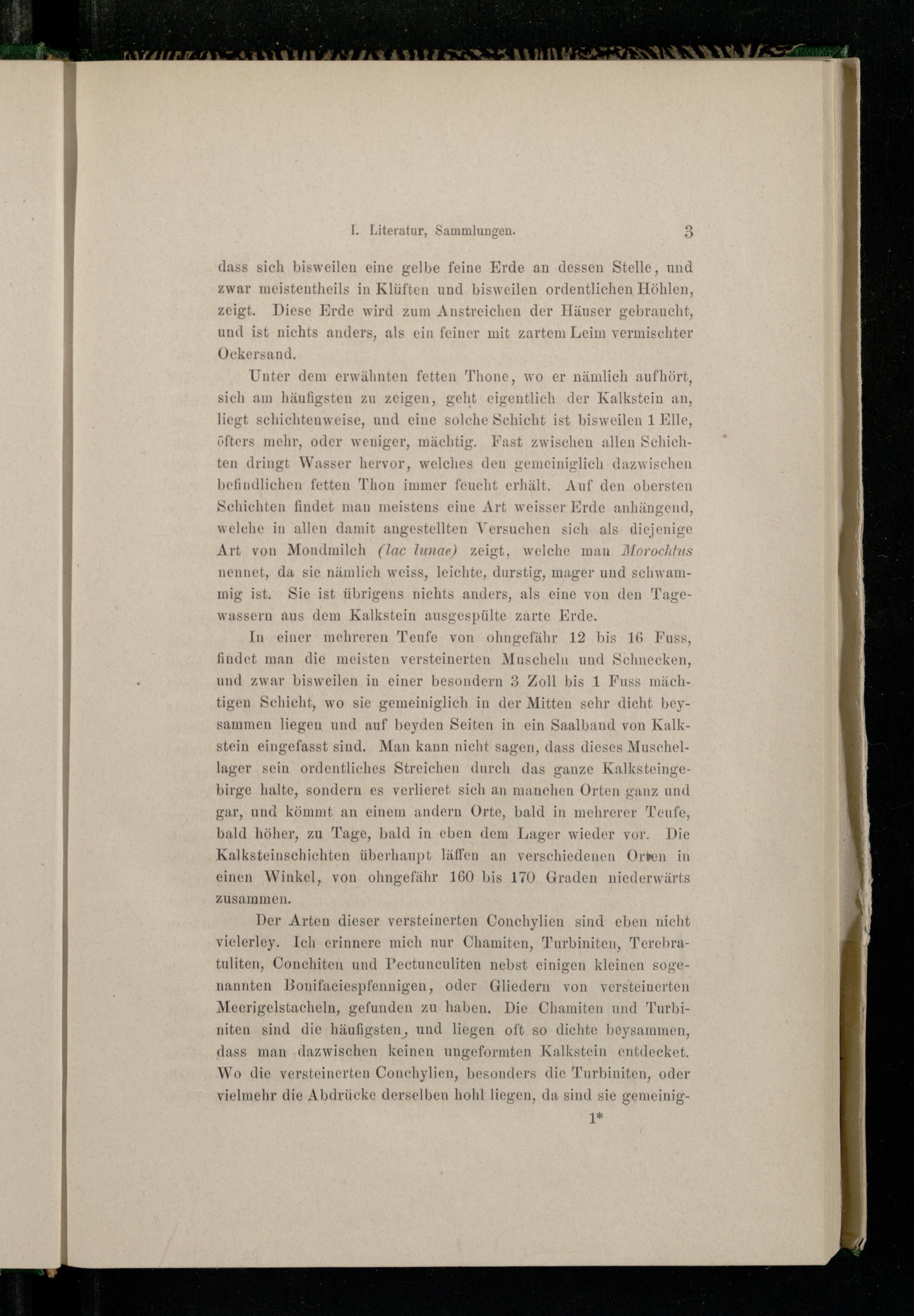 Der Arten dieser versteinerten Conchylien sind eben nicht vielerley. Ich erinnere mich nur Chamiten, Turbiniten, Terebratuliten, Conchiten und Pectunculiten nebst einigen kleinen sogenannten Bonifaciespfennigen, oder Gliedern von versteinerten Meerigelstacheln, gefunden zu haben, Die Chamiten und Turbiniten sind die häufigsten, und liegen oft so dichte beysammen, dass man ‚dazwischen keinen ungeformten Kalkstein entdecket. Wo die versteinerten Conchylien, besonders die"Turbiniten, oder vielmehr die Abdrücke derselben hohl liegen, da sind sie gemeinig1*