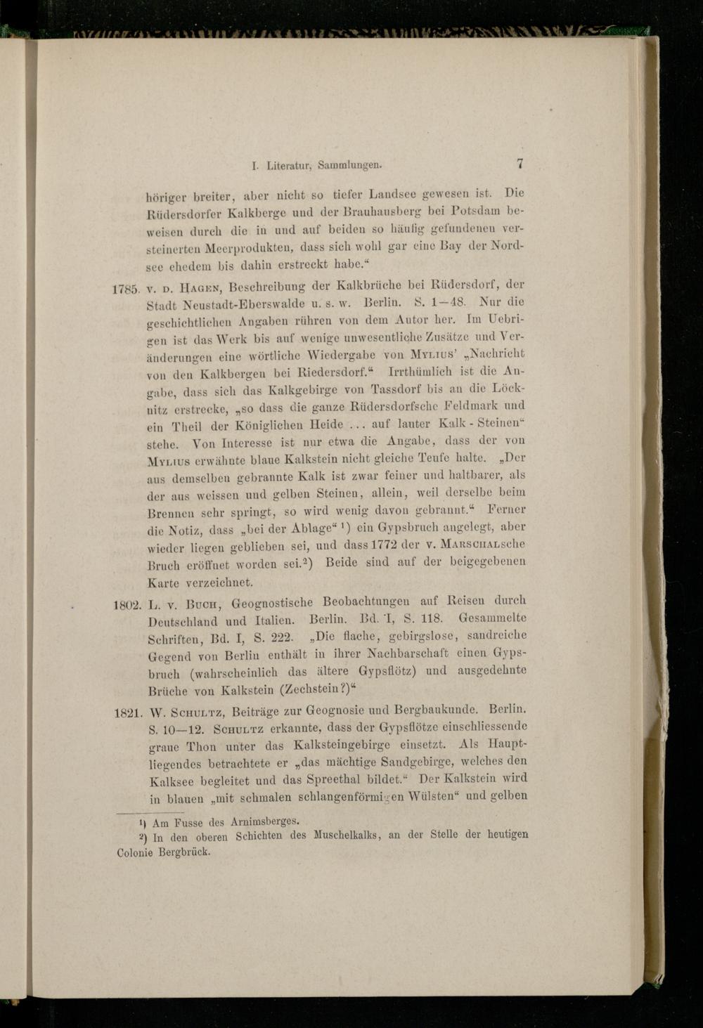 1785. v. D. HaAGzn, Beschreibung der Kalkbrüche bei Rüdersdorf, der Stadt Neustadt-Eberswalde u. s. w. Berlin. S. 1—48. Nur die geschichtlichen Angaben rühren von dem Autor her. Im Uebrigen ist das Werk bis auf wenige unwesentliche Zusätze und Veränderungen eine wörtliche Wiedergabe von Mry_ııvus’„Nachricht von den Kalkbergen bei Riedersdorf,.“ Irrthümlich ist die An