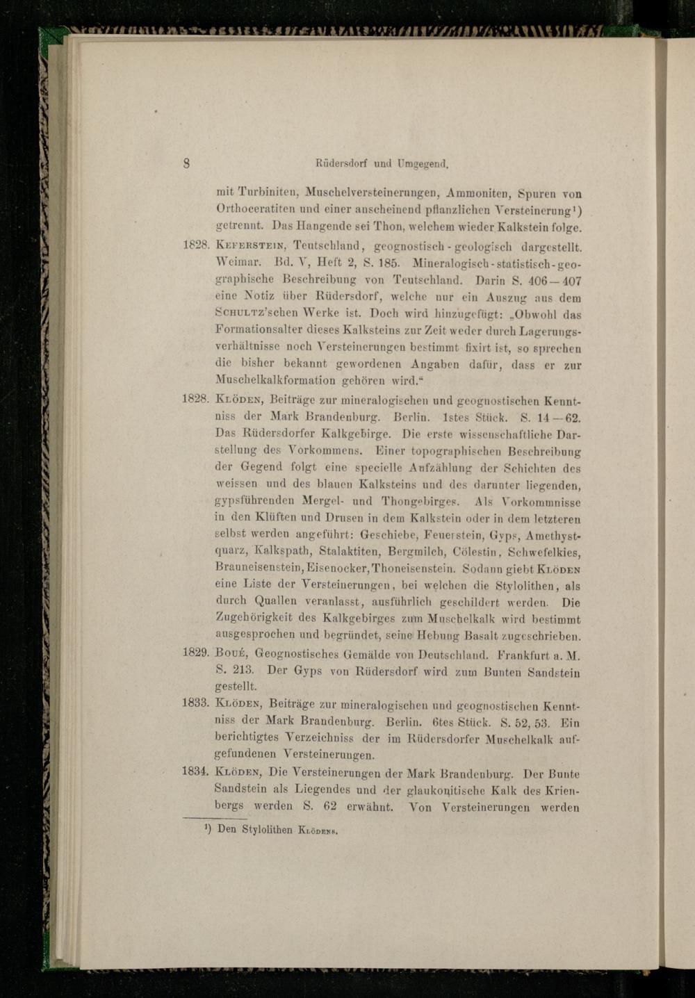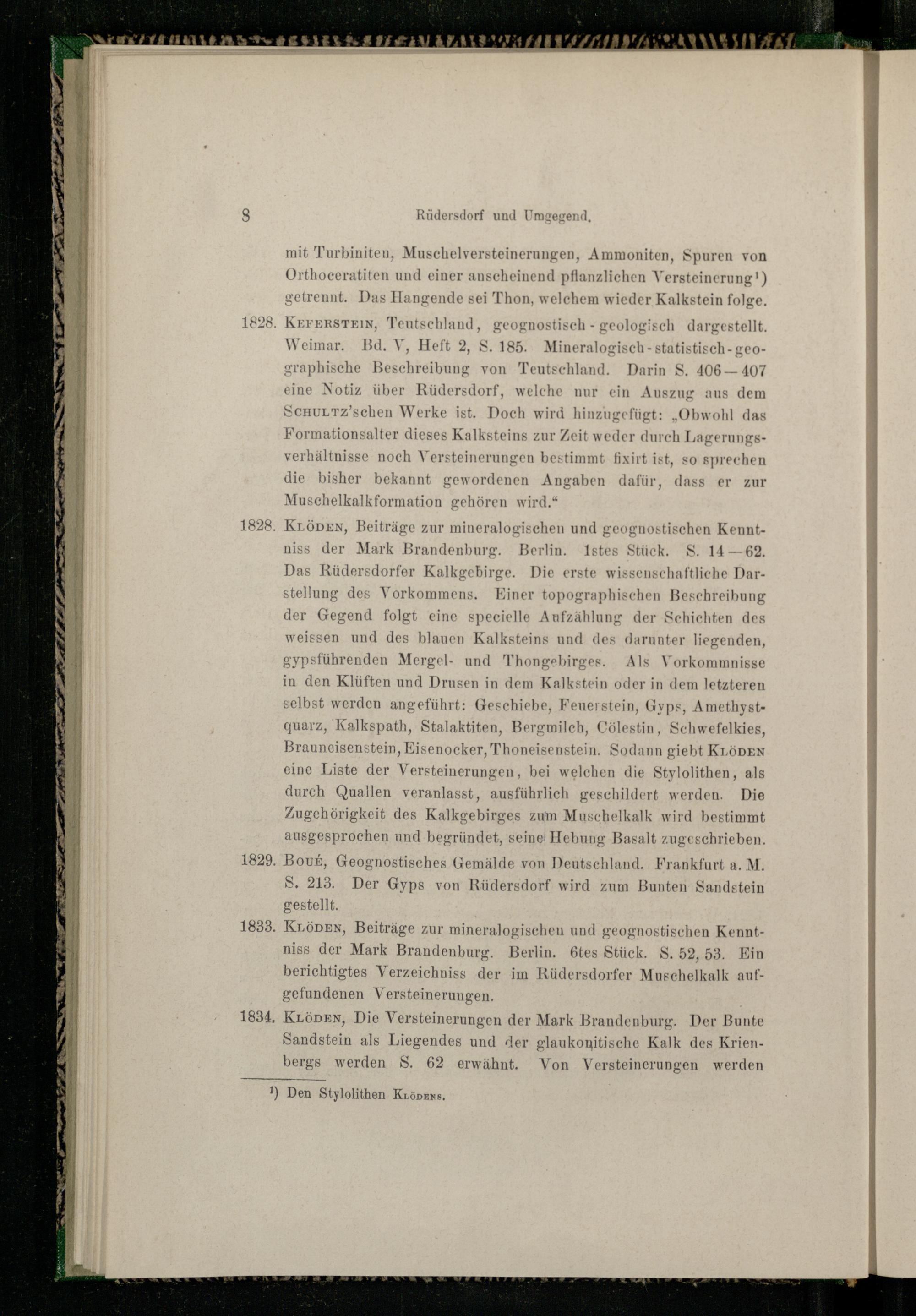 Das Rüdersdorfer Kalkgebirge. Die erste wissenschaftliche Darstellung des Vorkommens. Einer topographischen Beschreibung der Gegend folgt eine specielle Aufzählung der Schichten des weissen und des blauen Kalksteins und des darunter liegenden, gypsführenden Mergel- und Thongebirges. Als Vorkommnisse in den Klüften und Drusen in dem Kalkstein oder in dem letzteren selbst werden angeführt: Geschiebe, Feuerstein, Gyps, Amethystquarz, Kalkspath, Stalaktiten, Bergmilch, Cölestin, Schwefelkies, Brauneisenstein, Kisenocker, Thoneisenstein, Sodann giebt KLöDEN eine Liste der Versteinerungen, bei welchen die Stylolithen, als durch Quallen veranlasst, ausführlich geschildert werden. Die Zugehörigkeit des Kalkgebirges zum Muschelkalk wird bestimmt ausgesprochen und begründet, seine Hebung Basalt zugeschrieben.