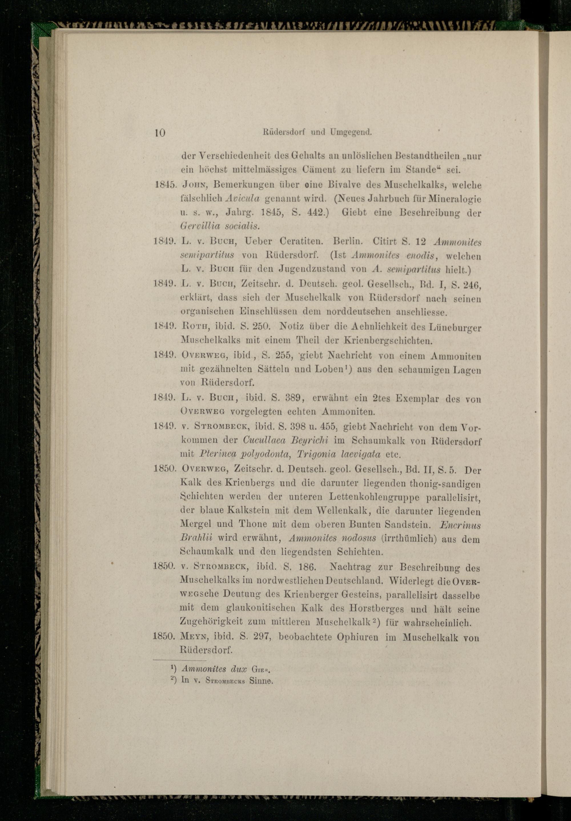 L. v. BucH, Ueber Ceratiten. Berlin. Citirt S. 12 Ammonites S« mipartitus von Rüdersdorf.(Ist Ammonites enodis, welchen L. v. BucH für den Jugendzustand von A. semipartitus hielt.) L. v. Bucyg, Zeitschr. d. Deutsch. geol. Gesellsch., Bd. I,