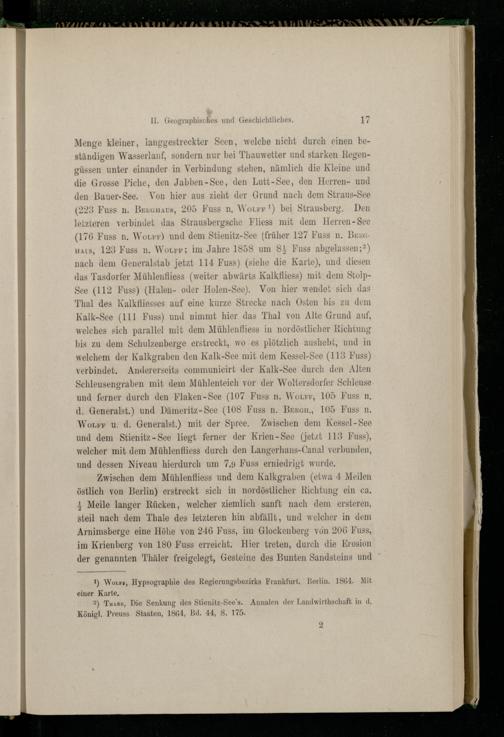 uavs, 123 Fuss n. Wourr; im Jahre 1858 um 8% Fuss abgelassen;?) nach dem Generalstab jetzt 114 Fuss)(siehe die Karte), und diesen das Tasdorfer Mühlenfliess(weiter abwärts Kalkfliess) mit. dem StolpSee(112 Fuss)(Halen- oder Holen-See). Von hier wendet sich das Thal des Kalkfliesses auf eine kurze Strecke nach Osten bis zu dem Kalk-See(111 Fuss) und nimmt hier das Thal von Alte Grund auf, welches sich parallel mit dem Mühlenfliess in nordöstlicher Richtung bis zu dem Schulzenberge erstreckt, wo es plötzlich aushebt, und in welchem der Kalkgraben den Kalk-See mit dem Kessel-See(113 Fuss) verbindet. Andererseits communicirt der Kalk-See durch den Alten Schleusengraben mit dem Mühlenteich vor der Woltersdorfer Schleuse und ferner durch den Flaken-See(107 Fuss n. Wonsrr, 105 Fuss n, d. Generalst.) und Dämeritz-See(108 Fuss n. Buren,, 105 Fuss n. Wowrr u. d. Generalst.) mit der Spree. Zwischen dem Kessel-See und dem Stienitz-See liegt ferner der Krien-See(jetzt 113 Fuss), welcher mit dem Mühlenfliess durch den Langerhans-Canal verbunden, und dessen Niveau hierdurch um 7,9 Fuss erniedrigt wurde. Zwischen dem Mühlenfliess und dem Kalkgraben(etwa 4 Meilen östlich von Berlin) erstreckt sich in nordöstlicher Richtung ein ca. 1 Meile langer Rücken, welcher ziemlich sanft nach dem ersteren, steil nach dem Thale des letzteren hin abfällt, und welcher in dem Arnimsberge eine Höhe von 246 Fuss, im Glockenberg von 206 Fuss, im Krienberg von 180 Fuss erreicht. Hier treten, durch die Erosion der genannten Thäler freigelegt, Gesteine des Bunten Sandsteins und