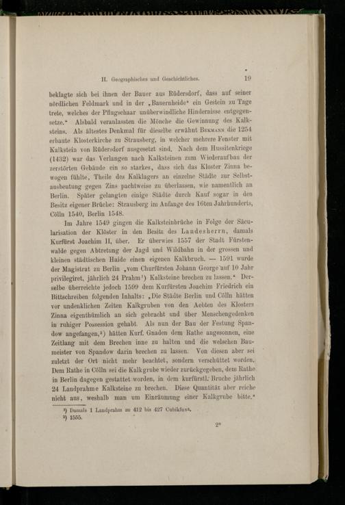 Im Jahre 1549 gingen die Kalksteinbrüche in Folge der Säcularisation der Klöster in den Besitz des Landesherrn, damals Kurfürst Joachim II, über. Er überwies 1557 der Stadt Fürstenwalde gegen Abtretung der Jagd und Wildbahn in der grossen und kleinen städtischen Haide einen eigenen Kalkbruch.— 1591 wurde der Magistrat zu Berlin„vom Churfürsten Johann George auf 10 Jahr privilegiret, jährlich 24 Prahm') Kalksteine brechen zu lassen,“ Derselbe überreichte jedoch 1599 dem Kurfürsten Joachim Friedrich ein Bittschreiben folgenden Inhalts:„Die Städte Berlin und Cölln hätten vor undenklichen Zeiten Kalkgruben von den Aebten des Klosters Zinna eigenthümlich an sich gebracht und über Menschengedenken in ruhiger Possession gehabt, Als nun der Bau der Festung Spandow angefangen,?) hätten Kurf. Gnaden dem Rathe angesonnen, eine Zeitlang mit dem Brechen inne zu halten und die welschen Baumeister von Spandow darin brechen zu lassen. Von diesen aber sei zuletzt der Ort nicht. mehr beachtet, sondern verschüttet worden. Dem Rathe in Cölln sei die Kalkgrube wieder zurückgegeben, dem Rathe in Berlin dagegen gestattet worden, in dem kurfürstl- Bruche jährlich 24 Landprahme Kalksteine zu brechen. Diese Quantität aber reiche nicht aus, weshalb man um KEinräumung einer Kalkgrube bitte,“