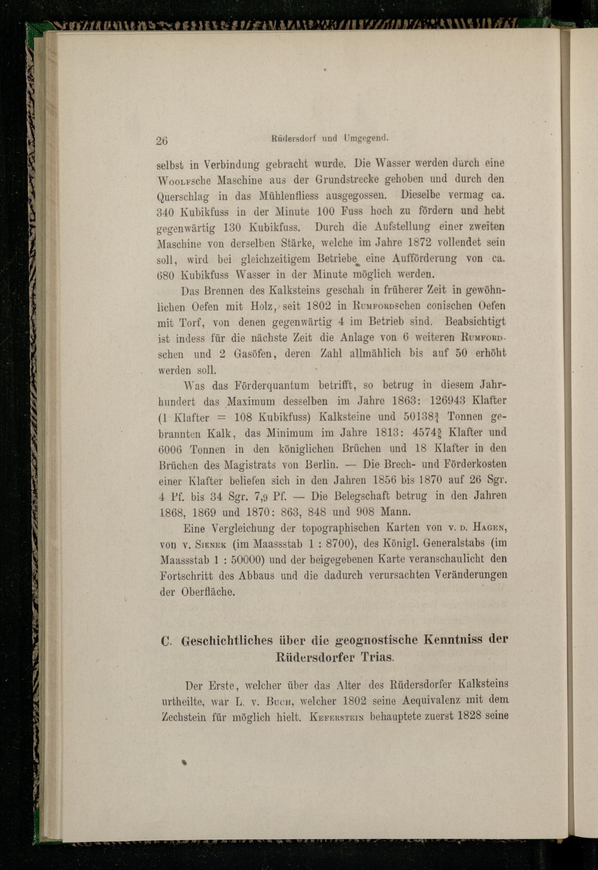 Der Erste, welcher über das Alter des Rüdersdorfer Kalksteins urtheilte, war L. v. Bucm, welcher 1802 seine Aequivalenz mit dem Zechstein für möglich hielt. Krrrrstern behauptete zuerst 1828 seine