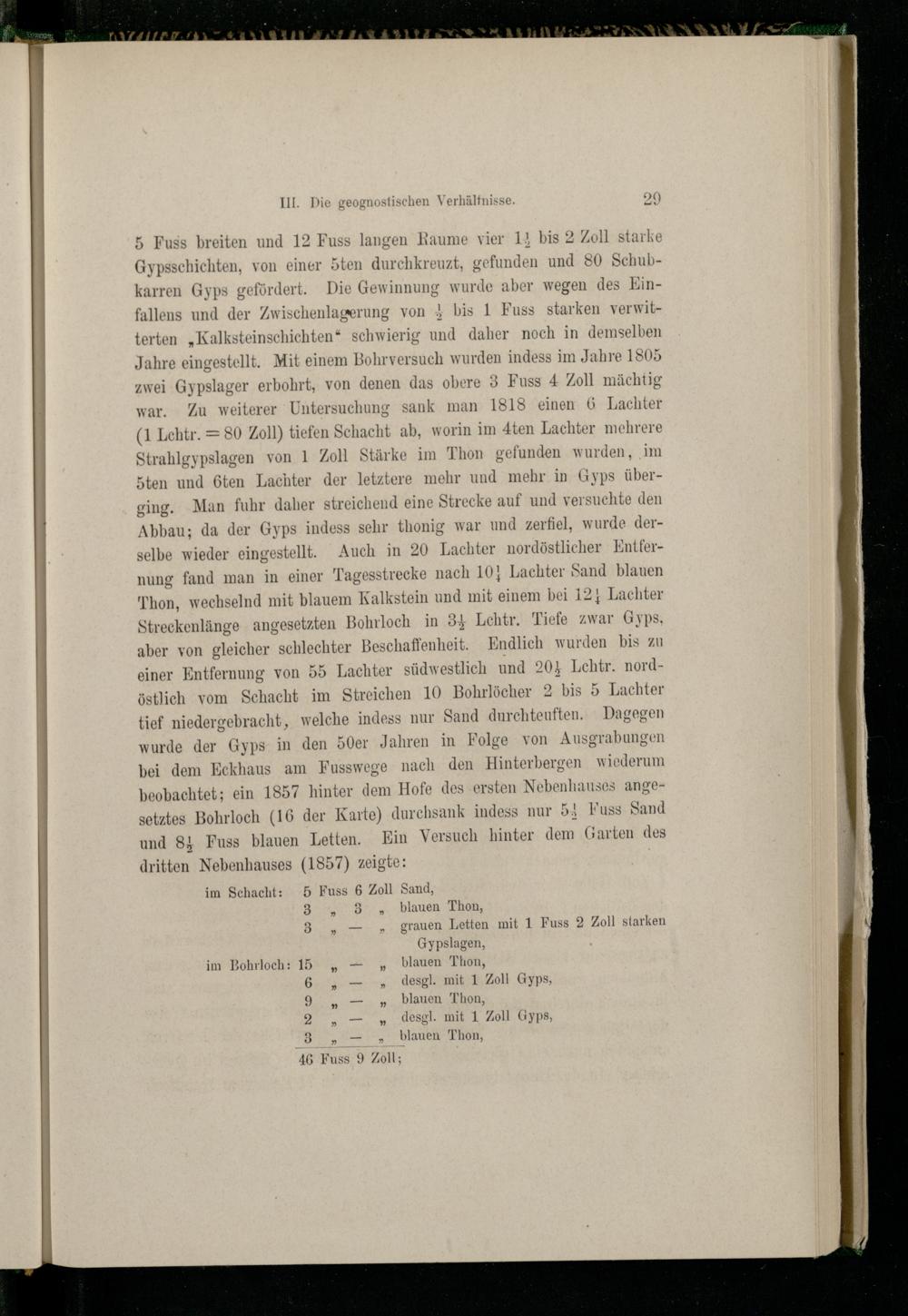5 Fuss breiten und 12 Fuss langen Raume vier 12 bis 2 Zoll starke Gypsschichten, von einer 5ten durchkreuzt, gefunden und 80 Schubkarren Gyps gefördert. Die Gewinnung wurde aber wegen des Einfallens und der Zwischenlagerung von+ bis 1 Fuss starken verwitterten„Kalksteinschichten“ schwierig und daher noch in demselben Jahre eingestellt. Mit einem Bohrversuch wurden indess im Jahre 1805 zwei Gypslager erbohrt, von denen das obere 3 Fuss 4 Zoll mächtig war. Zu weiterer Untersuchung sank man 1818 einen 6 Lachter (1 Lehtr.= 80 Zoll) tiefen Schacht ab, worin im 4ten Lachter mehrere Strahlgypslagen von 1 Zoll Stärke im Thon gefunden wurden, ‚im sten und 6ten Lachter der letztere mehr und mehr in Gyps überging. Man fuhr daher streichend eine Strecke auf und versuchte den Abbau; da der Gyps indess sehr thonig war und zerfiel, wurde derselbe wieder eingestellt. Auch in 20 Lachter nordöstlicher Entfernung fand man in einer Tagesstrecke nach 10} Lachter Sand blauen Thon, wechselnd mit blauem Kalkstein und mit einem bei 12} Lachter Streckenlänge angesetzten Bohrloch in 34 Lchtr. Tiefe zwar Gyps, aber von gleicher schlechter Beschaffenheit. Endlich wurden bis zu einer Entfernung von 55 Lachter südwestlich und 20% Lchtr. nordöstlich vom Schacht im Streichen 10 Bohrlöcher 2 bis 5 Lachter tief niedergebracht, welche indess nur Sand durchteuften. Dagegen wurde der Gyps in den 50er Jahren in Folge von Ausgrabungen bei dem Eckhaus am Fusswege nach den Hinterbergen wiederum beobachtet; ein 1857 hinter dem Hofe des ‚ersten Nebenhauses ange