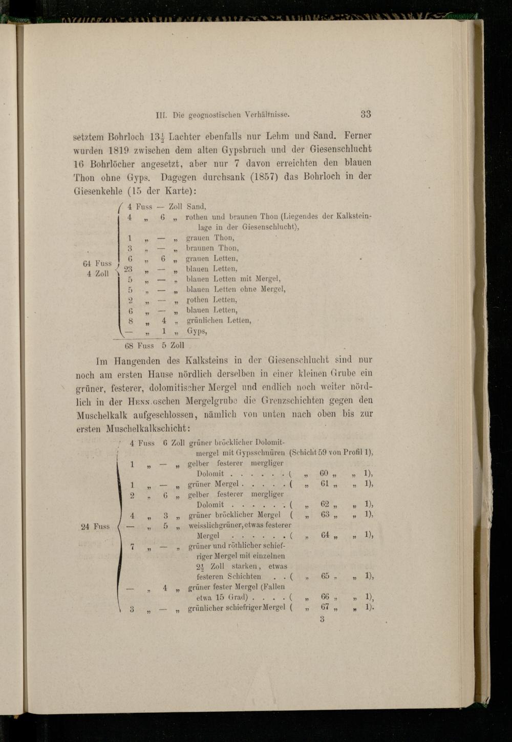 setztem Bohrloch 134 Lachter ebenfalls nur Lehm und Sand. Ferner wurden 1819 zwischen dem alten Gypsbruch und der Giesenschlucht 16 Bohrlöcher angesetzt, aber nur 7 davon erreichten den blauen
