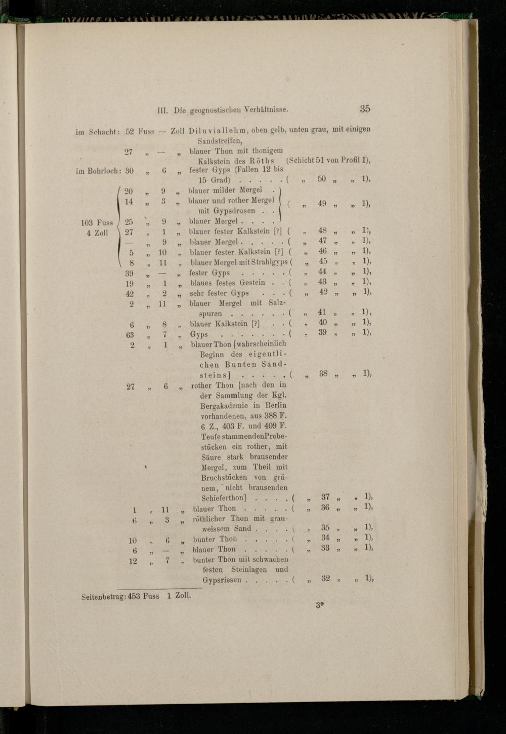 III. Die geognostischen Verhältnisse. 35 im Schacht: 52 Fuss Zoll Diluviallehm, oben gelb, unten grau, mit einigen Sandstreifen, N” ANA„blauer Thon mit thonigem Kalkstein des Röths(Schicht 51 von Profil 1), im Bohrloch: 30„ 6„ fester Gyps(Fallen 12 bis 15 Grad) ke 1#00. 5» ul) 90„9„blauer milder Mergel 14 HE OD auer und rother Mergel Cr AAO SD, mit Gypsdrusen 103 Fuss/ 25 9„ blauer Mergel. 4 Zoll.\ 27 51+7 blauer fester Kalkstein[?](48„.„*1) 9 a blauer Mergel a,(Sg AT.„ 4) 5"10: 4. blauer fester. Kalkstein;[?](>... 46;„1 \ 8.„ 11... blauer Mergel mit Strahlgyps(„4» ae J); 39». 4m Sester. GypS re an„ M4» I) 19; 1„blaues festes Gestein..(» Om» 1), 49 9 sch fester Gyps: u Rn A 2 11„ blauer Mergel mit SalzSPÜLEN A en AK 41 5, 1) 6 8 4. blauer Kalkstein[?].++ An 40 x Jh 63 A 7.„4 GypsS CN|» 489, 4)