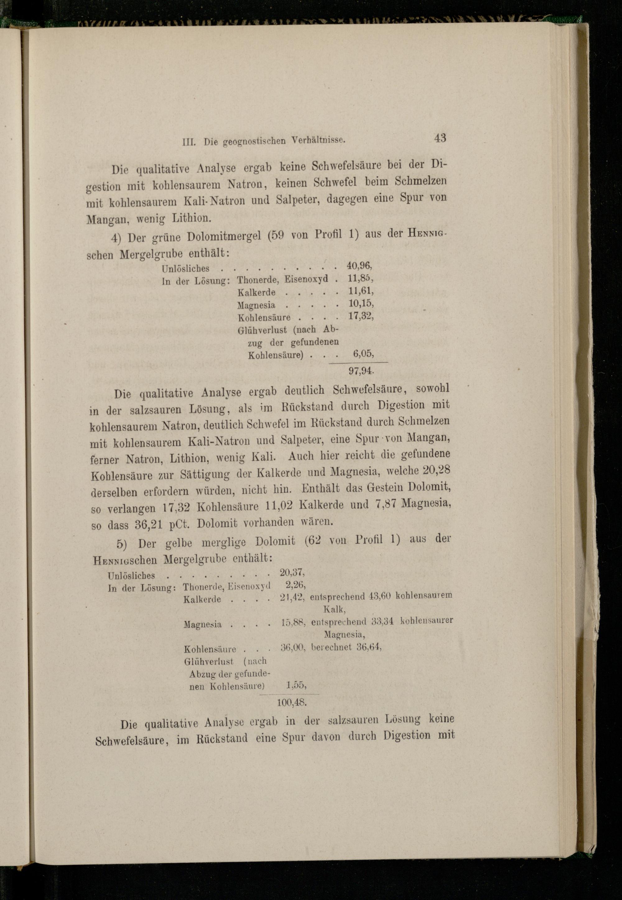 Unlösliches WR a 20,37, In der Lösung: Thonerde, Eisenoxyd 2,26, Kalkerde.... 21,42, entsprechend 43,60 kohlensaurem Kalk, Magnesia:.+ 15,88, entsprechend 33,34 kohlensaurer Magnesia, Kohlensäure... 36,00, berechnet 36,64,