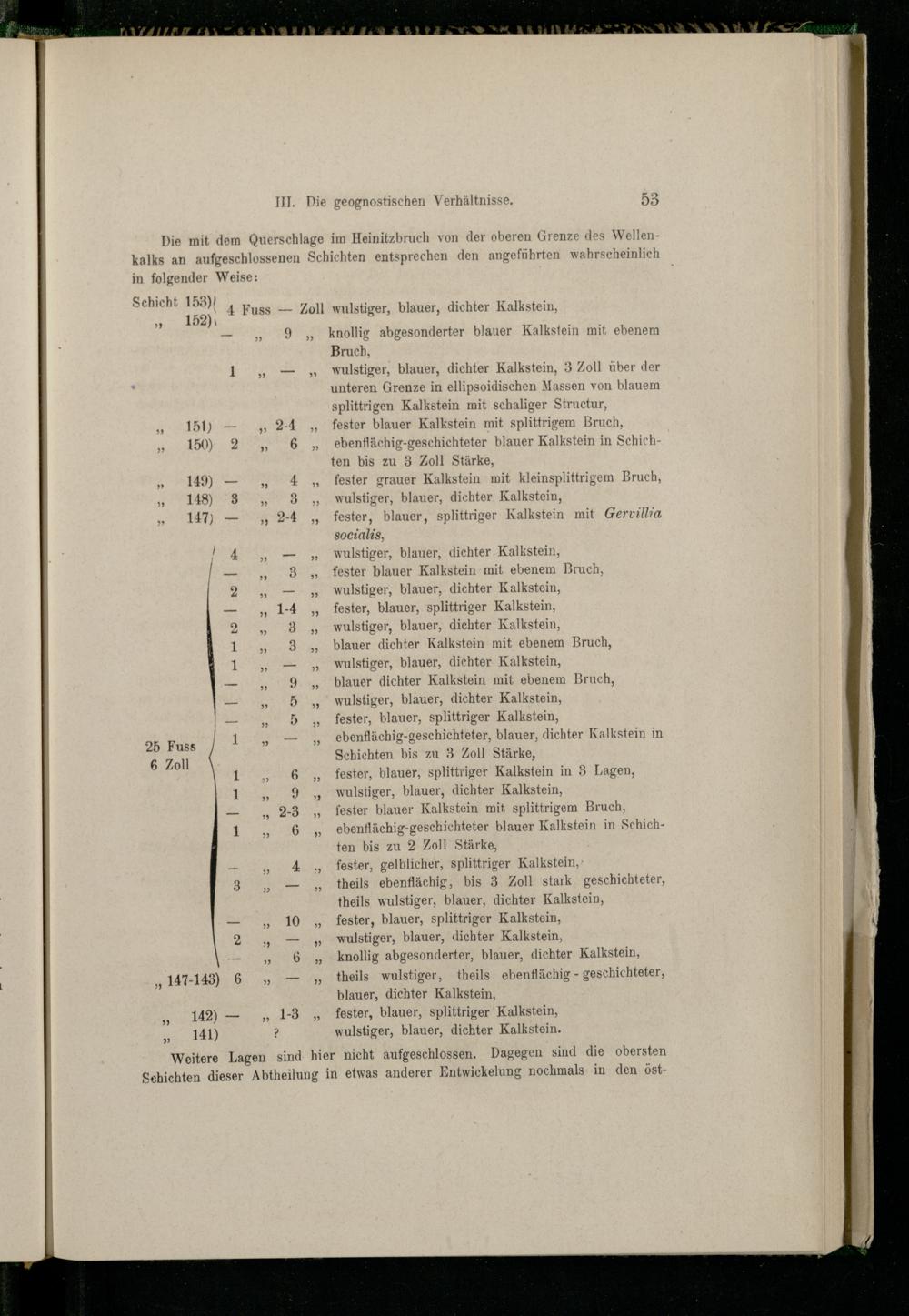 152) 4 Fuss— Zoll wulstiger, blauer, dichter Kalkstein, , DZ)\ , —„9„ knollig abgesonderter blauer Kalkstein mit ebenem Bruch, 1„—„ wulstiger, blauer, dichter Kalkstein, 3 Zoll über der