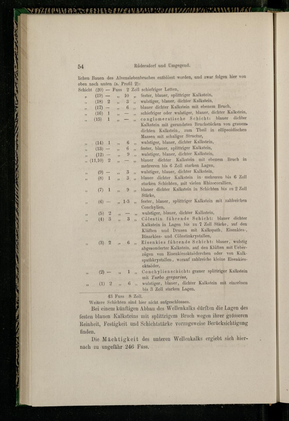 Cölestin führende Schicht: blauer dichter Kalkstein in. Lagen bis zu 7 Zoll Stärke, auf den Klüften und Drusen mit Kalkspath, Kisenkies-, Zinarkies- und Cölestinkrystallen,