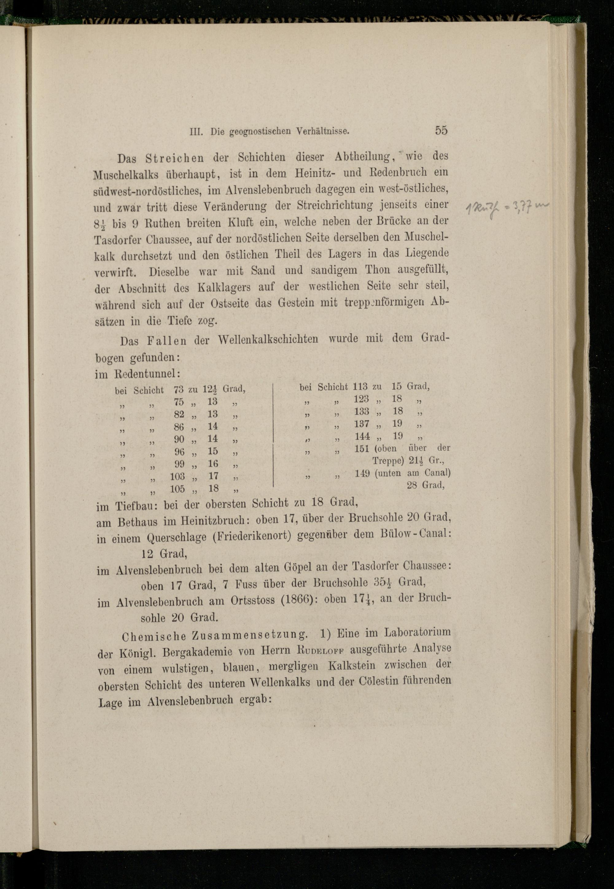 Das Streichen der Schichten dieser Abtheilung,“ wie des Muschelkalks überhaupt, ist in dem Heinitz- und Redenbruch em südwest-nordöstliches, im Alvenslebenbruch dagegen ein west-östliches, und zwar tritt diese Veränderung der Streichrichtung jenseits einer 81 bis 9 Ruthen breiten Kluft ein, welche neben der Brücke an der Tasdorfer Chaussee, auf der nordöstlichen Seite derselben den Muschelkalk durchsetzt und den östlichen Theil des Lagers in das Liegende verwirft. Dieselbe war mit Sand und sandigem Thon ausgefüllt, der Abschnitt des Kalklagers auf der westlichen Seite sehr steil, während sich auf der Ostseite das Gestein mit treppunförmigen Absätzen in die Tiefe zog.