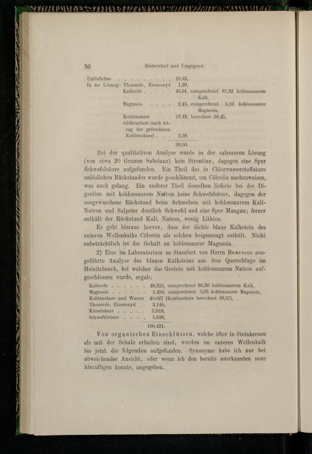 Es geht hieraus hervor, dass der dichte blaue Kalkstein des unteren Wellenkalks Cölestin als solchen beigemengt enthält. Nicht unbeträchtlich ist der Gehalt an kohlensaurer Magnesia.
