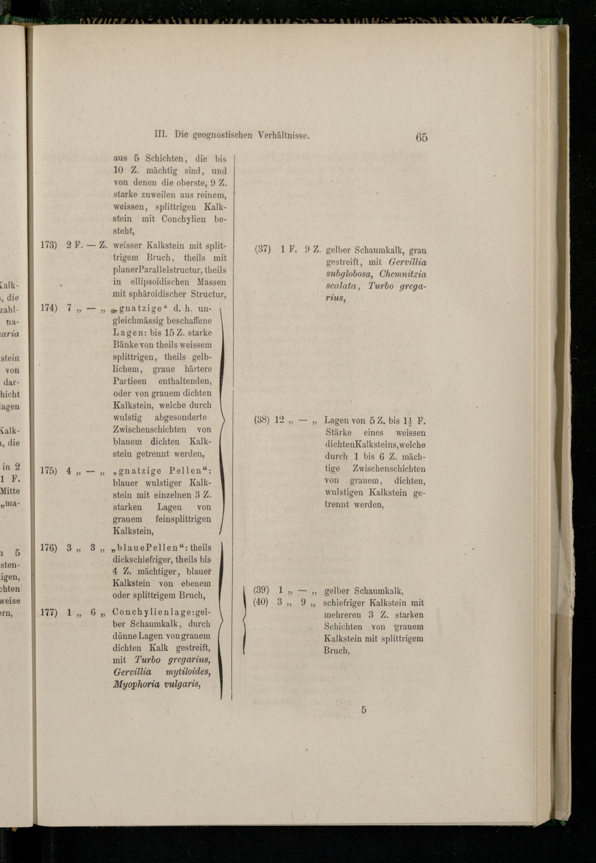 weisser Kalkstein mit splittrigem Bruch, theils mit planerParallelstructur, theils in ellipsoidischen Massen mit sphäroidischer Structur, a gnatzige“.d. h. un-\ gleichmässig beschaffene Lagen: bis 15 Z. starke Bänke von theils weissem splittrigen, theils gelblichem, graue härtere Partieen enthaltenden, oder von grauem dichten Kalkstein, welche durch wulstig abgesonderte Zwischenschichten von blauem dichten Kalk