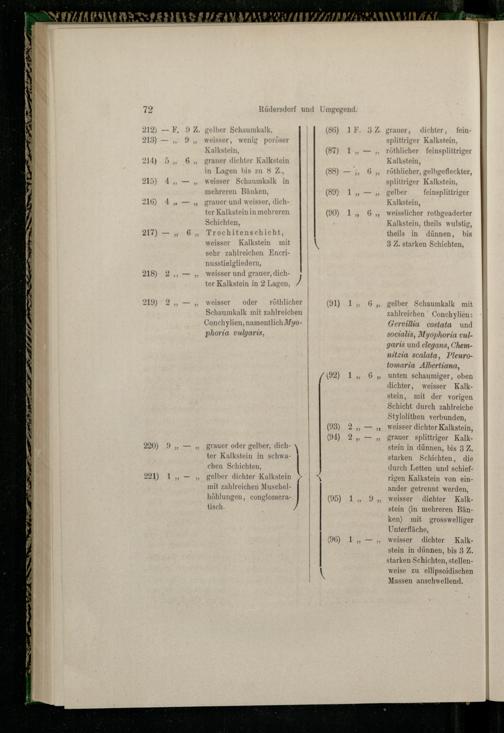 weisser dichter Kalkstein, grauer splittriger Kalkstein in dünnen, bis 3 Z, starken Schichten, die durch Letten und schiefrigen Kalkstein von einander getrennt werden, dichter Kalkstein(in mehreren Bänken) mit