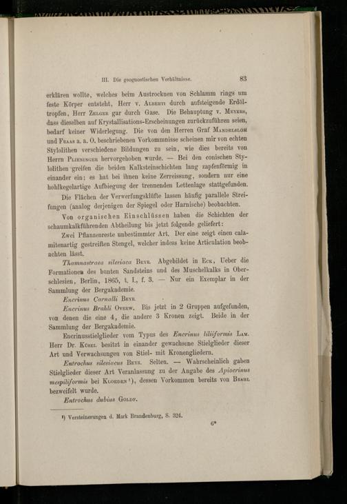 Entrochus silesiacus Beyer. Selten.— Wahrscheinlich gaben Stielglieder dieser Art Veranlassung zu der Angabe des Apiocrinus mespiliformis bei Kıozpen!), dessen Vorkommen bereits von BrauL bezweifelt wurde,
