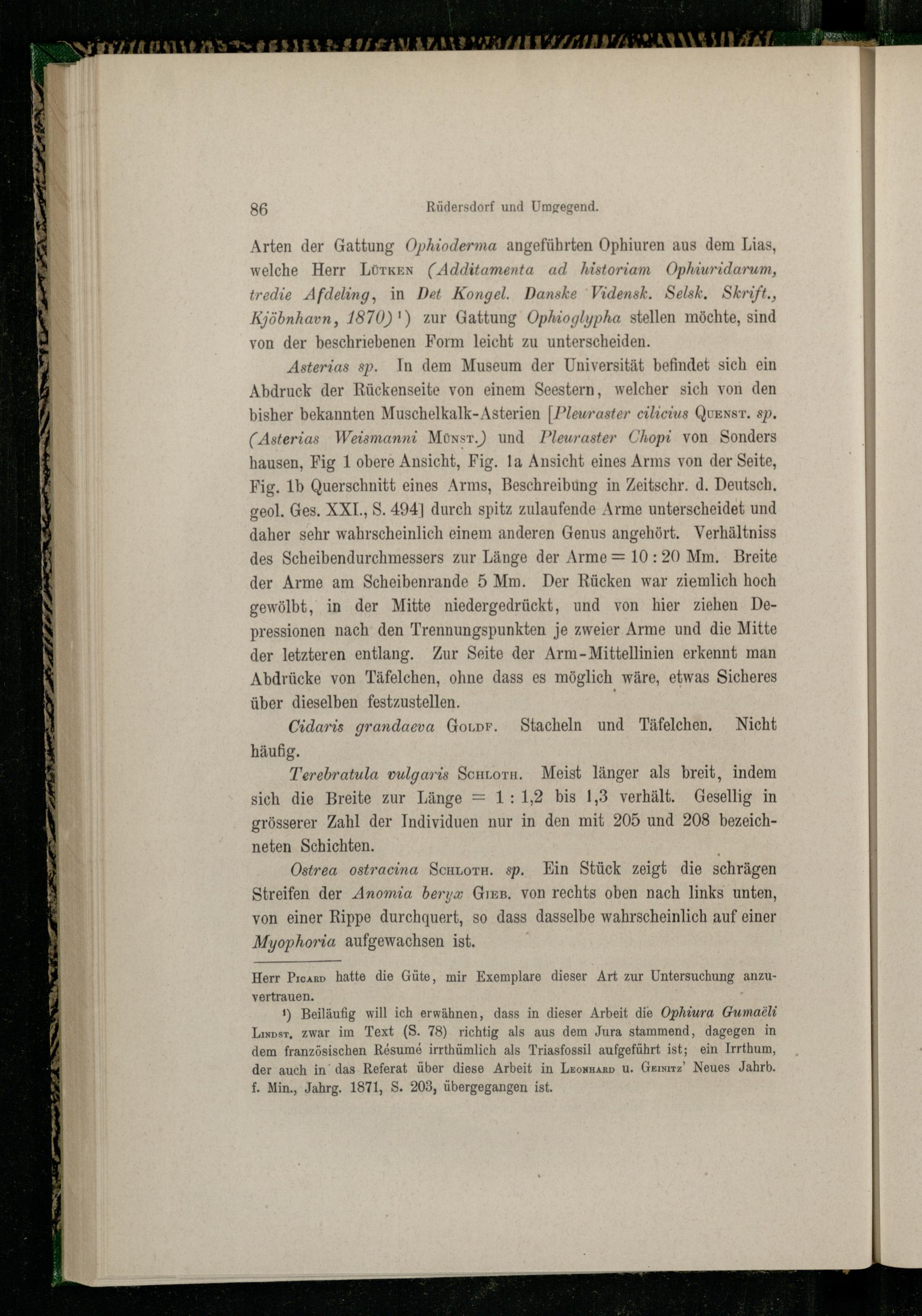 1) Beiläufig will ich erwähnen, dass in dieser Arbeit die Ophiura Guma8li Lıxnsr, zwar im Text(S. 78) richtig als aus dem Jura stammend, dagegen in dem französischen Resume irrthümlich als Triasfossil aufgeführt ist; ein Irrthum, der auch in’ das. Referat über diese Arbeit in LzoxmarD u. Gemrz’ Neues Jahrb. f. Min., Jahrg. 1871, S. 203, übergegangen ist.