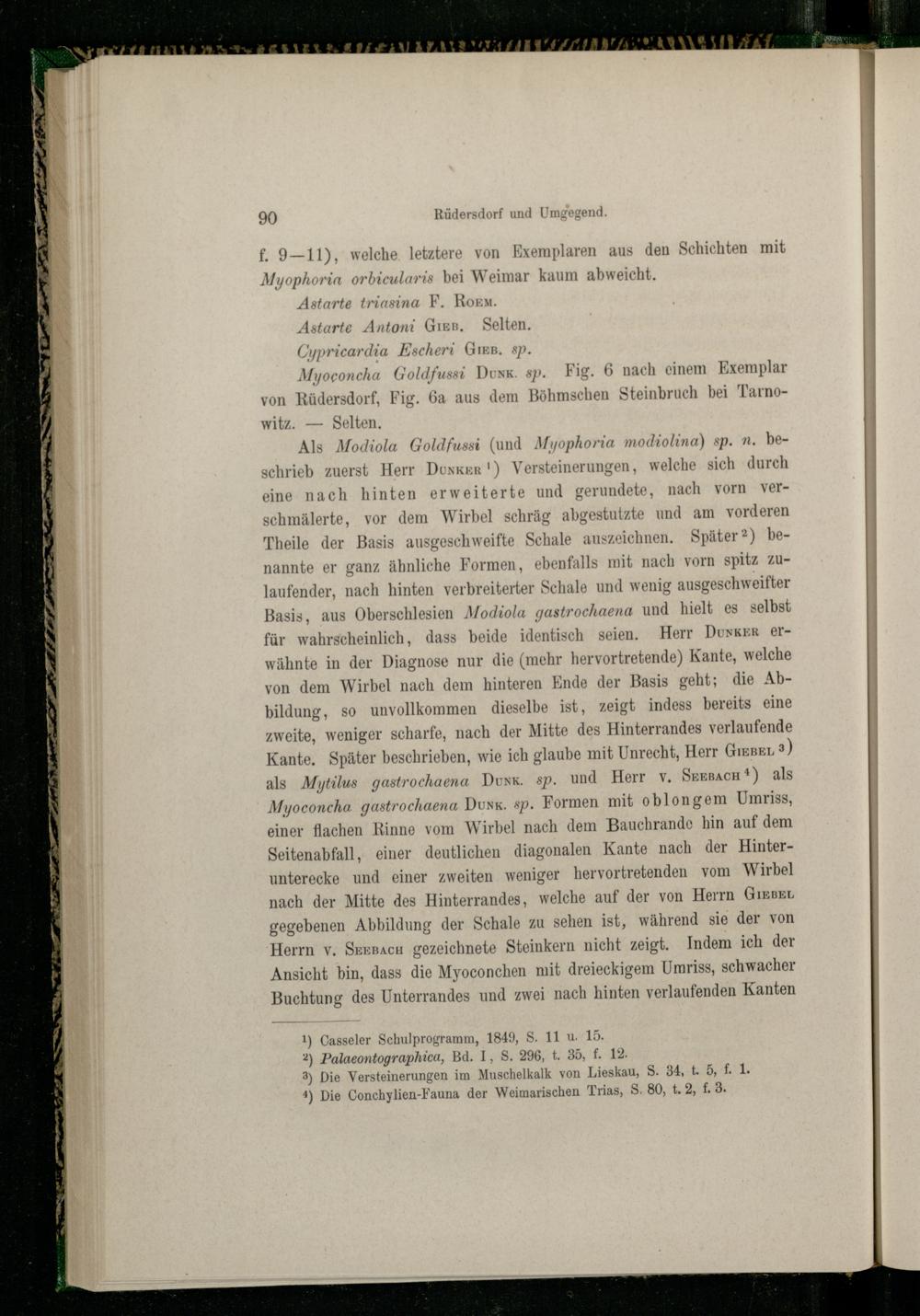 Als Modiola Goldfussi(und Myophoria modiolina) sp. N. beschrieb zuerst Herr Dunker!) Versteinerungen, welche sich durch eine nach hinten erweiterte und gerundete, nach vorn verschmälerte, vor dem Wirbel schräg abgestutzte und am vorderen Theile der Basis ausgeschweifte Schale auszeichnen. Später”) benannte er ganz ähnliche Formen, ebenfalls mit nach vorn spitz zulaufender, nach hinten verbreiterter Schale und wenig ausgeschweifter Basis, aus Oberschlesien Modiola gastrochaena und hielt es selbst für wahrscheinlich, dass beide identisch seien. Herr DunxKErR erwähnte in der Diagnose nur die(mehr hervortretende) Kante, welche von dem Wirbel nach dem hinteren Ende der Basis geht; die Abbildung, so unvollkommen dieselbe ist, zeigt indess bereits eine zweite, weniger scharfe, nach der Mitte des Hinterrandes verlaufende Kante. Später beschrieben, wie ich glaube mit Unrecht, Herr Gı1EBEL 3) als Mytilus gastrochaena Duxk. sp. und Herr v. SezsacH*) als Myoconcha gastrochaena Dun’. sp. Formen mit oblongem Umriss, einer flachen Rinne vom Wirbel nach dem Bauchrande hin auf dem Seitenabfall, einer deutlichen diagonalen Kante nach der Hinterunterecke und einer zweiten weniger hervortretenden vom Wirbel nach der Mitte des Hinterrandes, welche auf der von Herrn GiEBEL gegebenen Abbildung der Schale zu sehen ist, während sie der von Herrn v. Sexsacu gezeichnete Steinkern nicht zeigt. Indem ich der Ansicht bin, dass die Myoconchen mit dreieckigem Umriss, schwacher Buchtung des Unterrandes und zwei nach hinten verlaufenden Kanten