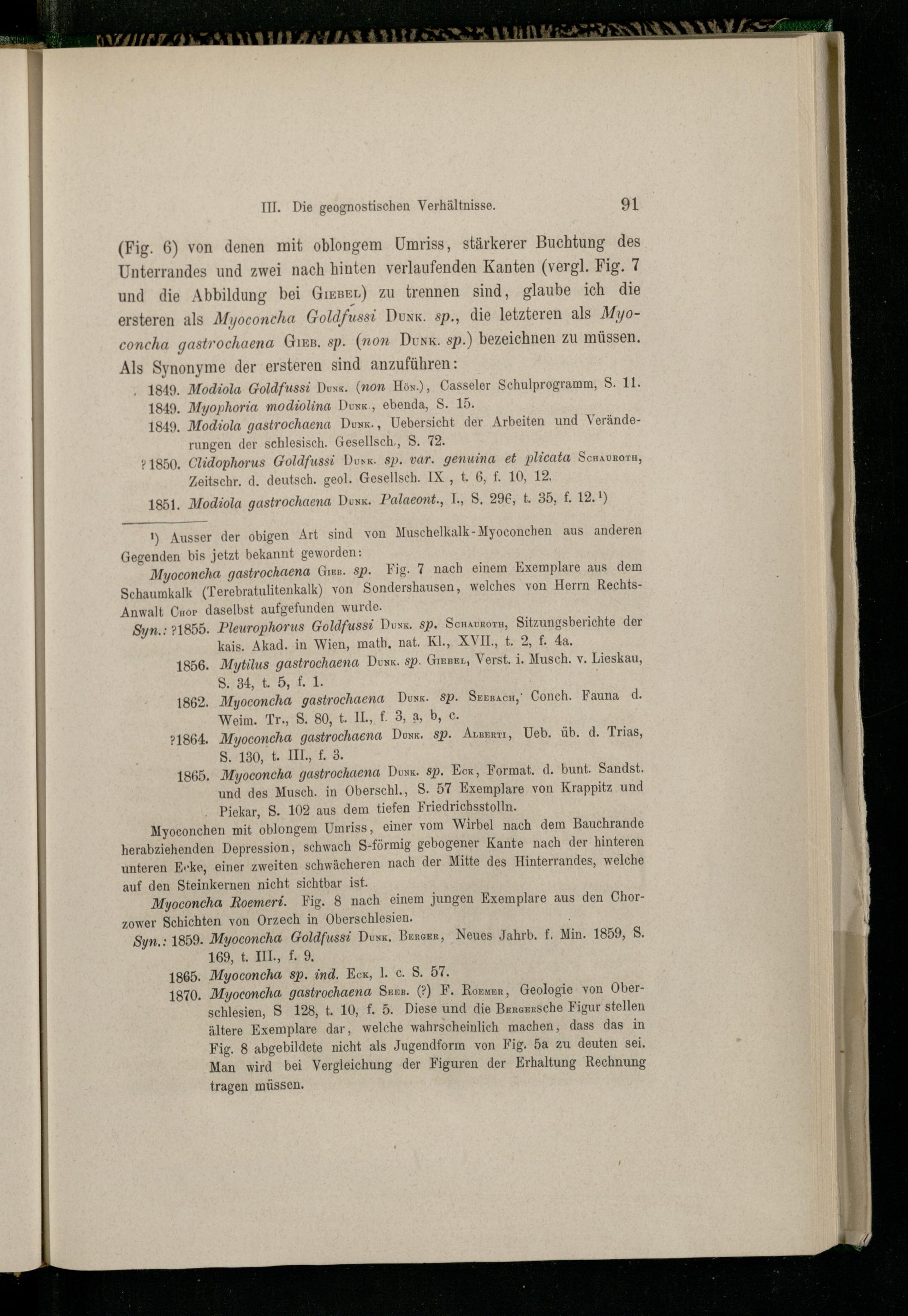 1870. Myoconcha gastrochaena Sees.(?) F. Rozwer, Geologie von Oberschlesien, S 128, t. 10, f. 5. Diese und die Berenrsche Figur stellen ältere Exemplare dar, welche wahrscheinlich machen, dass das in Fig. 8 abgebildete nicht als Jugendform von Fig. 5a zu deuten sei, Man wird bei Vergleichung ‚der Figuren der Erhaltung Rechnung tragen müssen.