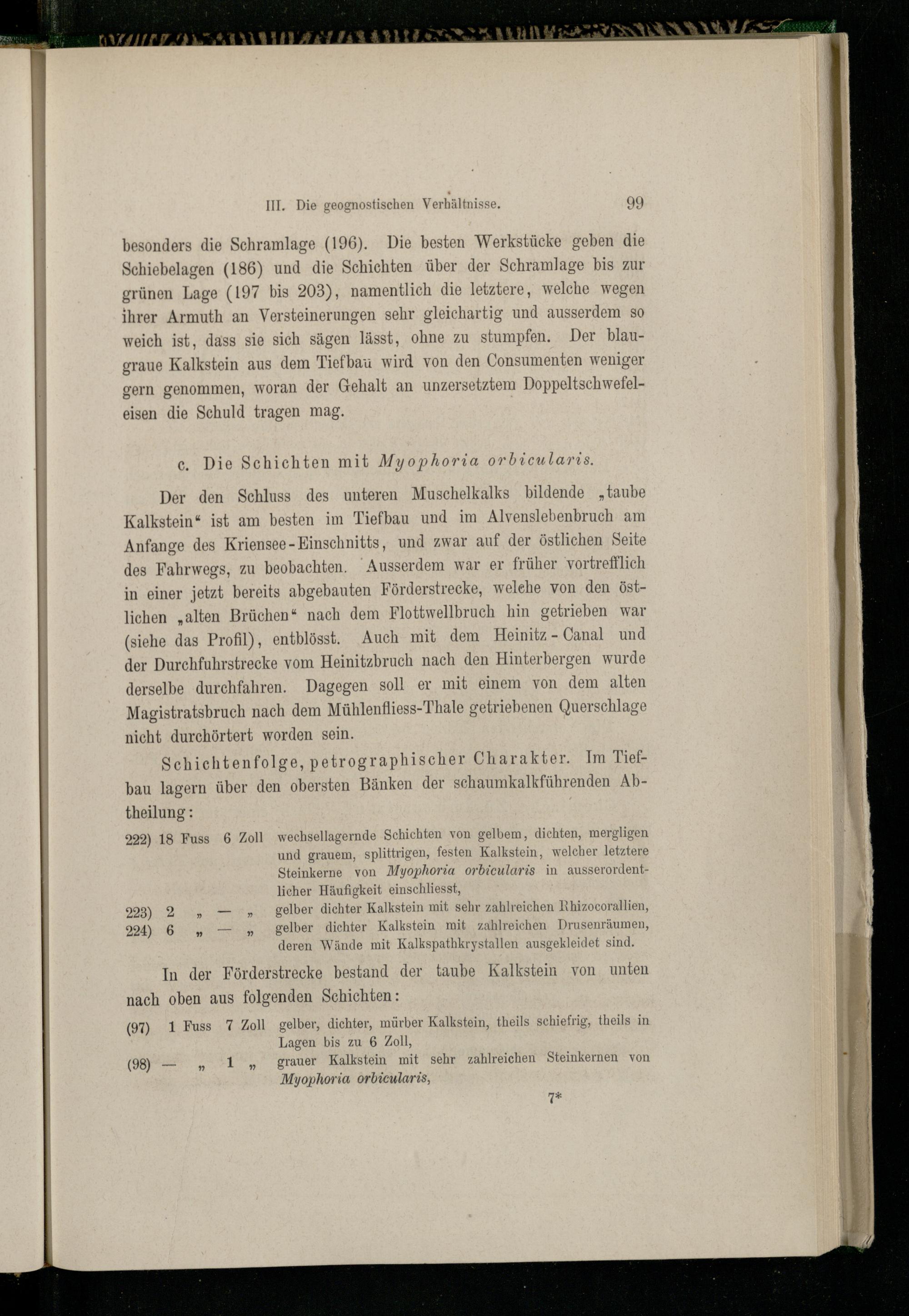 In der Förderstrecke bestand der taube Kalkstein von unten nach oben aus folgenden Schichten: (97) 1 Fuss 7 Zoll gelber, dichter, mürber Kalkstein, theils schiefrig, theils in Lagen bis zu 6 Zoll, (98)—»„ 1» grauer Kalkstein mit sehr zahlreichen Steinkernen von Myophoria orbicularis, 7*