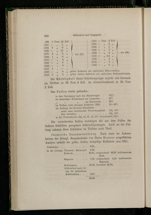 Chemische Zusammensetzung. Nach einer im.Laboratorium der Königl. Bergakademie von Herrn RuprLorr ausgeführten Analyse enthält der gelbe, dichte, mergelige Kalkstein(aus 222): Unlösliches. all er ek ac 1820,