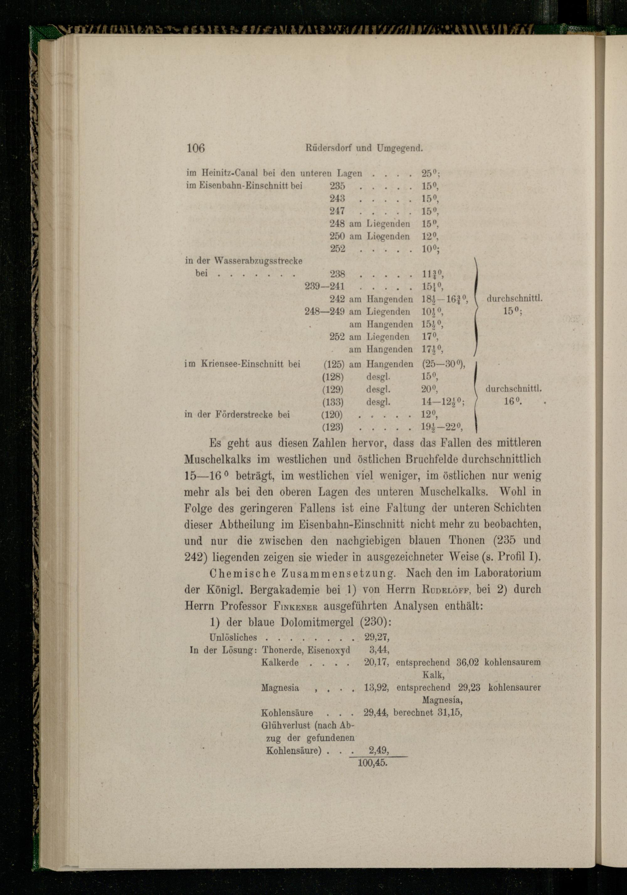 im Heinitz-Canal bei den unteren Lagen.. ‚5050: im Eisenbahn-Einschnitt bei 235 159, 248 su 4150, 247 a N 59 248 am Liegenden 15°, 250 am Liegenden 12°, 252 10% in der Wasserabzugsstrecke bei 238 Ce en I 289241 EEE 242 am Hangenden 184—163°, durchschnittl. 248—249 am Liegenden 10%°, 159; am Hangenden 154°, 252 am Liegenden 17°% am Hangenden 174°, im Kriensee-Einschnitt bei(125) am Hangenden(25—30°%, (128) desgl. 15°, (129) desgl. 20°9, durchschnittl. (133) desgl. 14—1249;/ 16°, in der Förderstrecke bei(120) n ON AA