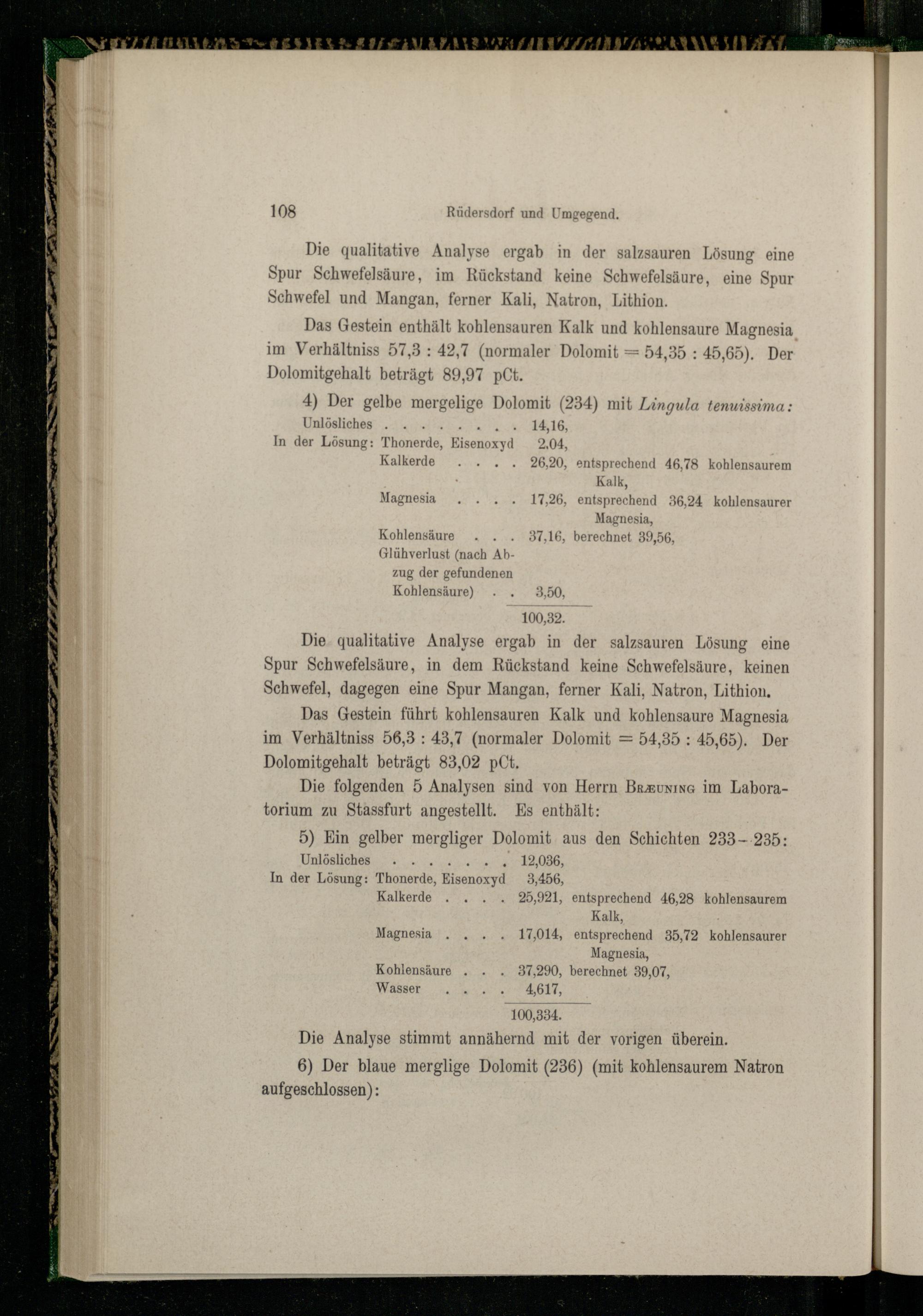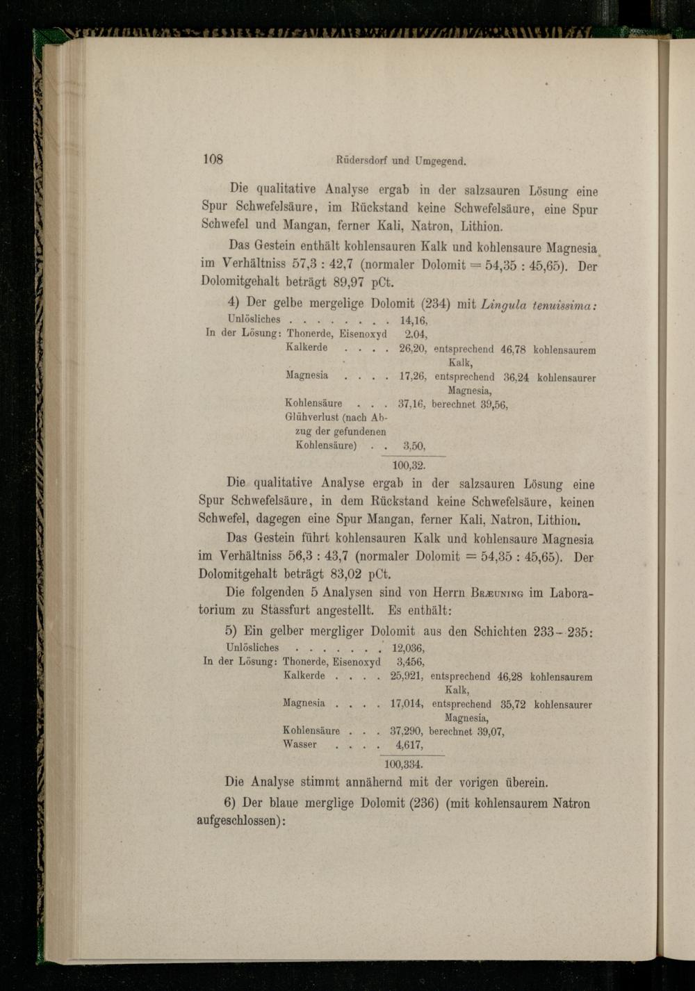 Unlösliche8 4 a MAEIG; In der Lösung: Thonerde, Eisenoxyd 2,04, Kalkerde 26,20, entsprechend 46,78 kohlensaurem Kalk, Magnesia.+++ 17,26, entsprechend 36,24 kohlensaurer Magnesia, Kohlensäure... 37,16, berechnet 39,56,