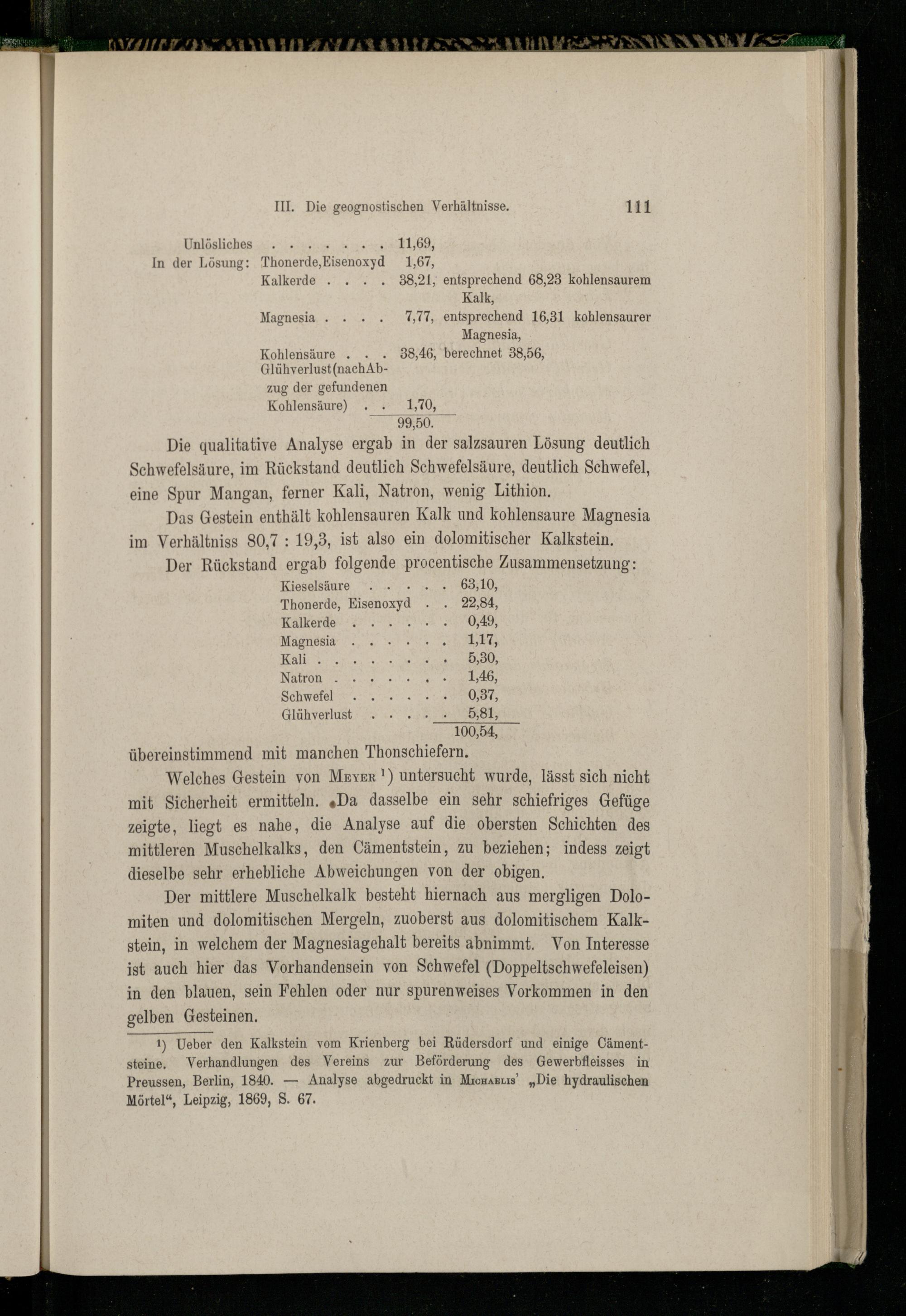 Welches Gestein von Mever!) untersucht wurde, lässt sich nicht mit Sicherheit ermitteln. eDa dasselbe ein sehr schiefriges Gefüge zeigte, liegt es nahe, die Analyse auf die obersten Schichten des mittleren Muschelkalks, den Cämentstein, zu beziehen; indess zeigt dieselbe sehr erhebliche Abweichungen von der obigen,