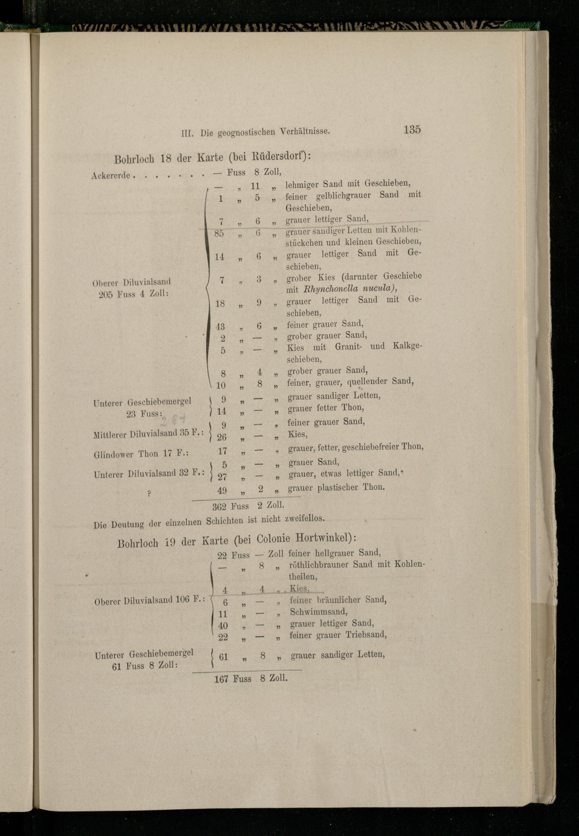 Bohrloch 18 der Karte(bei Rüdersdorf): Ackererde...„4 Russ 48 Zoll, 1 lehmiger Sand mit Geschieben, feiner gelblichgrauer Sand mit Geschieben, grauer lettiger Sand, andiger Letten mit Kohlen stückchen und kleinen Geschieben, grauer lettiger Sand mit Geschieben, Oberer Diluvialsand ES orober Kies(darunter Geschiebe 205 Fuss 4 Zoll: mit Rhynchonella nucula), grauer lettiger Sand mit Geschieben, feiner grauer Sand, grober grauer Sand, Kies mit Granit- und Kalkgeschieben, grober grauer Sand, feiner, grauer, quellender Sand, grauer sandiger Letten, grauer fetter Thon,