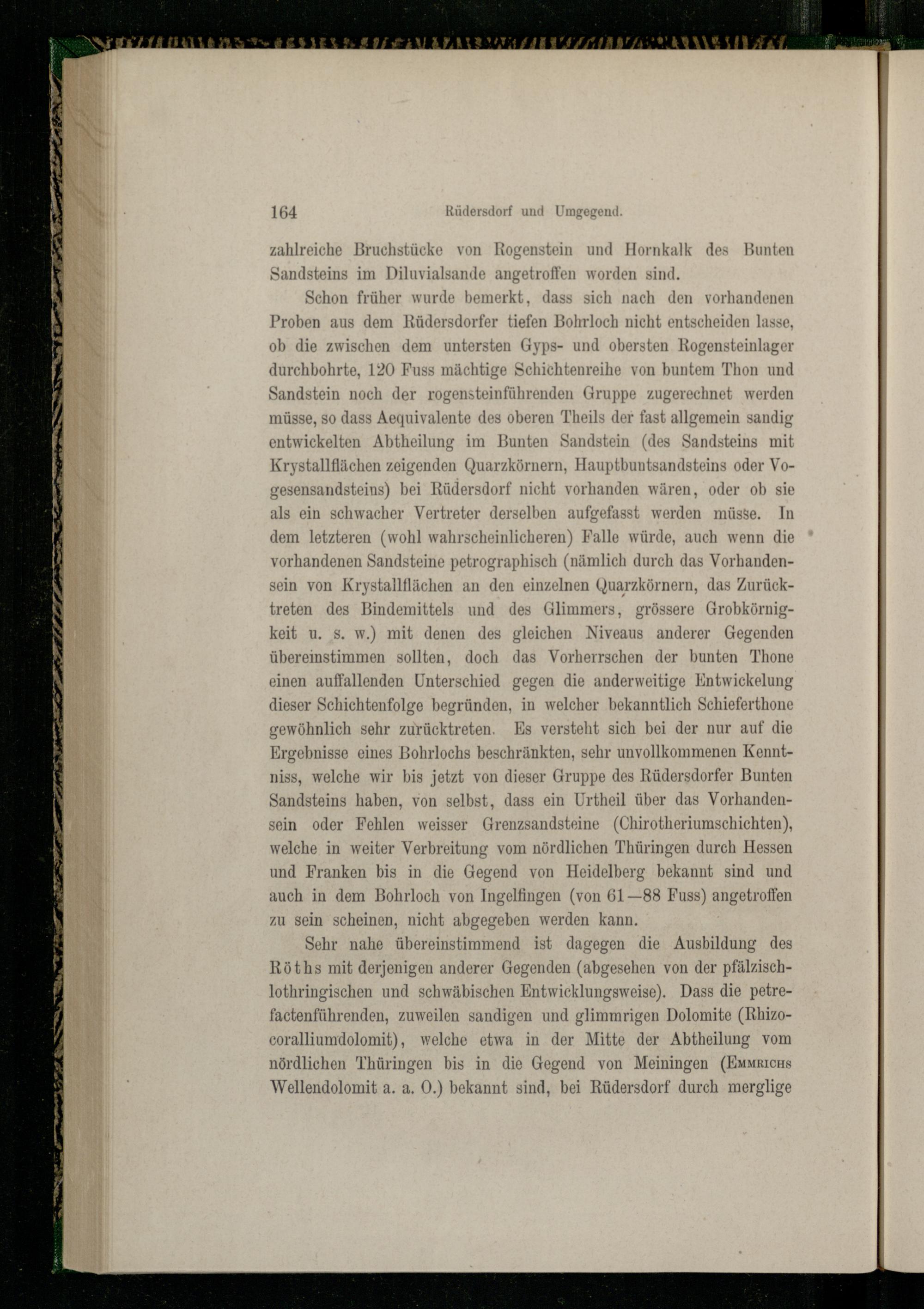 Sehr nahe übereinstimmend ist dagegen die Ausbildung des Röths mit derjenigen anderer Gegenden(abgesehen von der pfälzischlothringischen und schwäbischen Entwicklungsweise). Dass die petrefactenführenden, zuweilen sandigen und glimmrigen Dolomite(Rhizocoralliumdolomit), welche etwa in der Mitte der Abtheilung vom nördlichen Thüringen bis in die Gegend von Meiningen(EmmrıcHys Wellendolomit a. a, 0.) bekannt sind, bei Rüdersdorf durch merglige