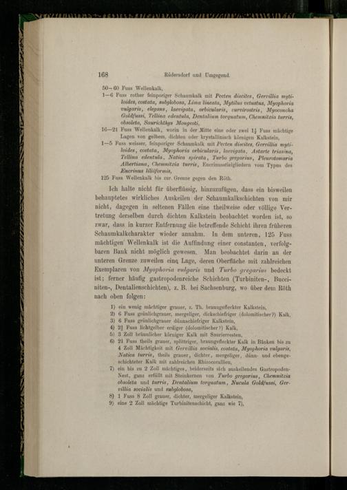 6) 21 Fuss theils grauer, splittriger, braungefleckter Kalk in Bänken bis zu 4 Zoll Mächtigkeit mit Gervillia socialis, costata, Myophoria vulgaris, Natica turris, theils grauer, dichter, mergeliger, dünn- und ebengeschichteter Kalk mit zahlreichen Rhizocorallien, ein bis zu 2 Zoll mächtiges, beiderseits sich auskeilendes GastropodenNest, ganz erfüllt mit Steinkernen von Zurbo gregarius, Chemmnitzia obsoleta und turris, Dentalium torquatum, Nucula Goldfussi, Gervillca socialis und subglobosa,