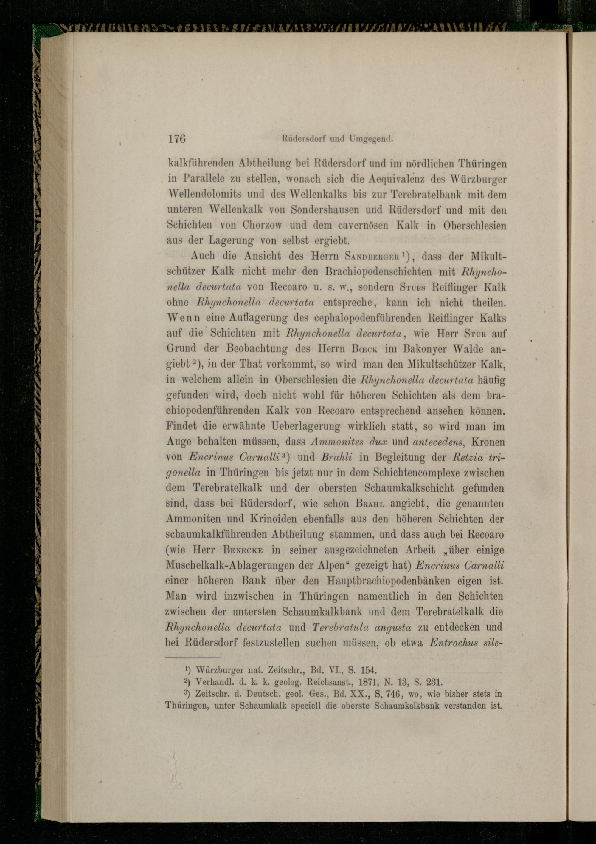 kalkführenden Abtheilung bei Rüdersdorf und im nördlichen Thüringen in Parallele zu stellen, wonach sich die Aequivalenz des Würzburger Wellendolomits und des Wellenkalks bis zur Terebratelbank mit dem unteren Wellenkalk von Sondershausen und Rüdersdorf und mit den Schichten von Chorzow und dem cavernösen Kalk in Oberschlesien aus der Lagerung von selbst ergiebt.