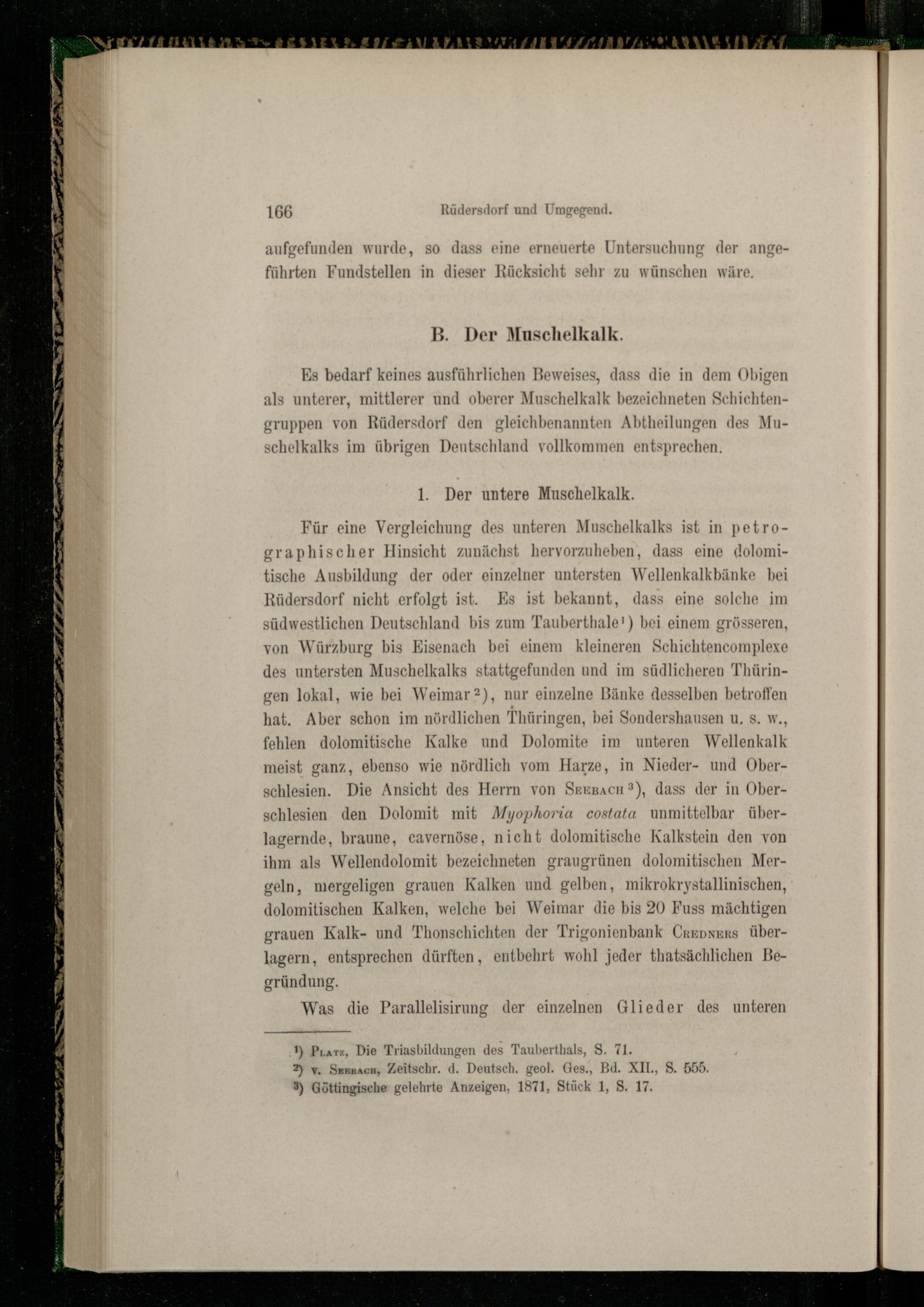 fehlen dolomitische Kalke und Dolomite im unteren Wellenkalk meist ganz, ebenso wie nördlich vom Harze, in Nieder- und Oberschlesien. Die Ansicht des Herrn von SeesacH?), dass der in Oberschlesien den Dolomit mit Myophoria costata unmittelbar überlagernde, braune, cavernöse, nicht dolomitische Kalkstein den von ihm als Wellendolomit bezeichneten graugrünen dolomitischen Mergeln, mergeligen grauen Kalken und gelben, mikrokrystallinischen, dolomitischen Kalken, welche bei Weimar die bis 20 Fuss mächtigen grauen Kalk- und Thonschichten der Trigonienbank Crenners Überlagern, entsprechen dürften, entbehrt wohl jeder thatsächlichen Begründung.