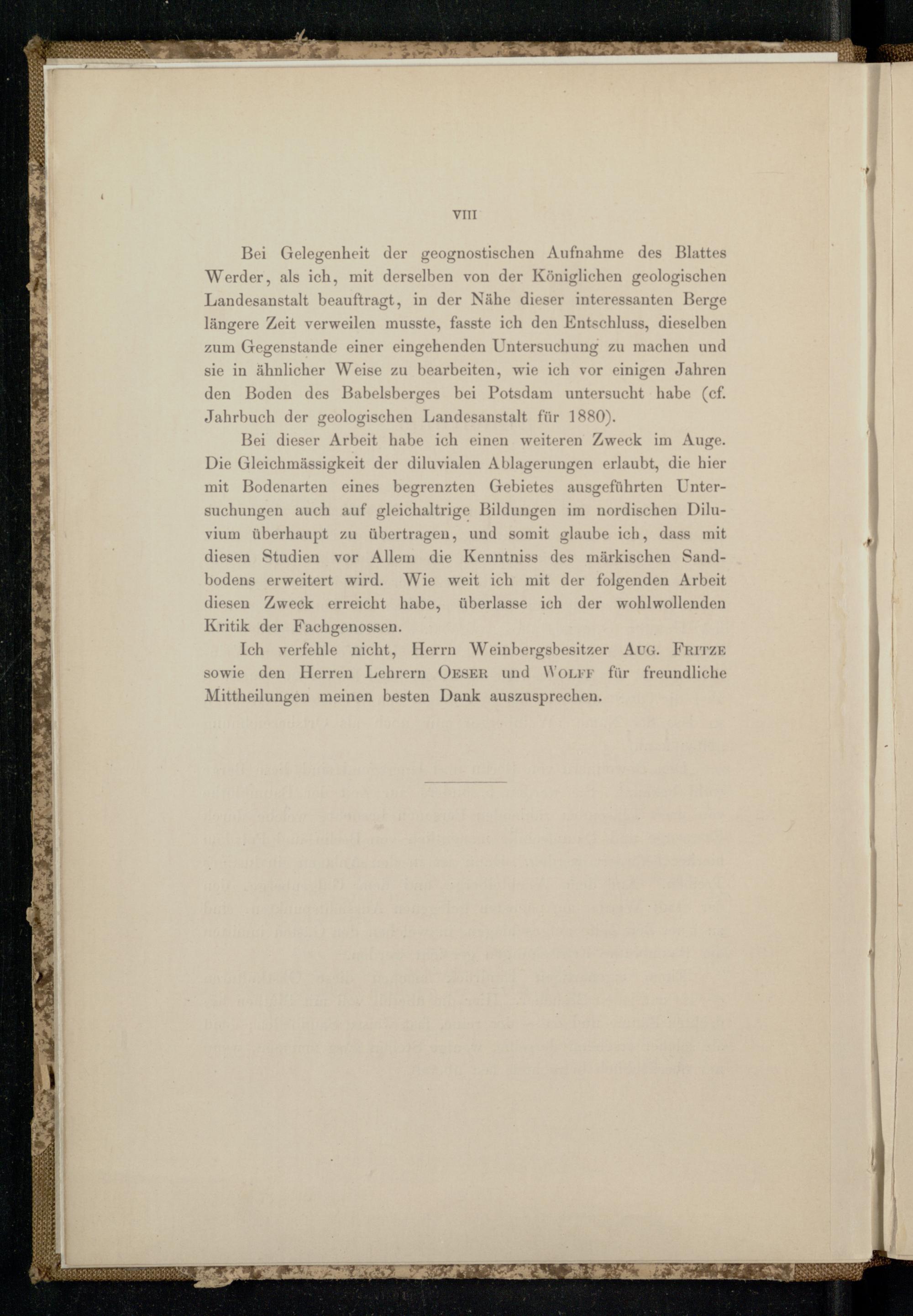 Bei dieser Arbeit habe ich einen weiteren Zweck im Auge. Die Gleichmässigkeit der diluvialen Ablagerungen erlaubt, die hier mit Bodenarten eines begrenzten Gebietes ausgeführten Untersuchungen auch auf gleichaltrige Bildungen im nordischen Diluvium überhaupt zu übertragen, und somit glaube ich, dass mit diesen Studien vor Allem die Kenntniss des märkischen Sandbodens erweitert wird. Wie weit ich mit der folgenden Arbeit diesen Zweck erreicht habe, überlasse ich der wohlwollenden Kritik der Fachgenossen.