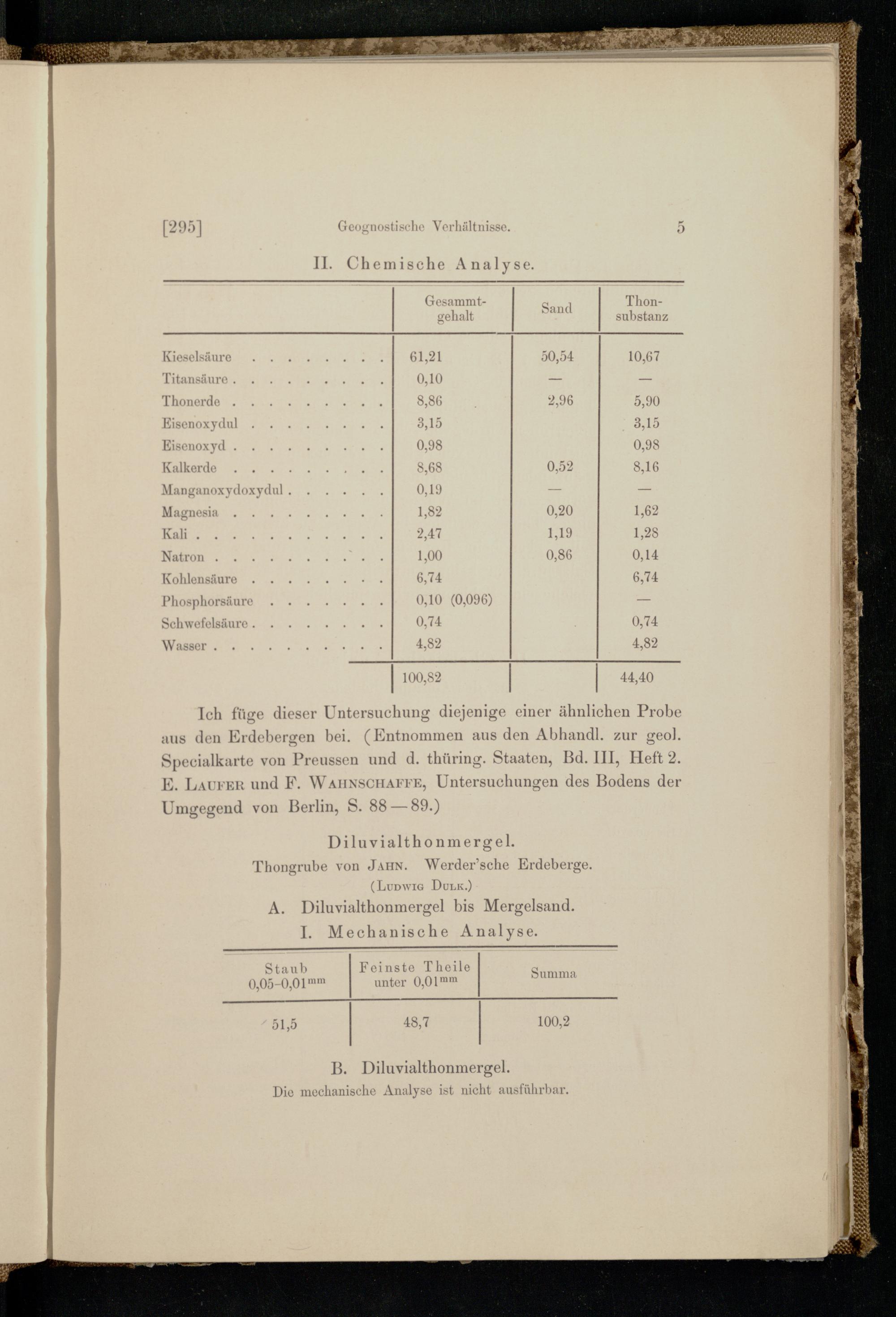 Ich füge dieser Untersuchung diejenige einer ähnlichen Probe aus den Erdebergen bei.(Entnommen aus den Abhandl. zur geol. Specialkarte von Preussen und d. thüring. Staaten, Bd. III, Heft 2. E. LAUFER und F. WAHNSCHAFFE, Untersuchungen des Bodens der