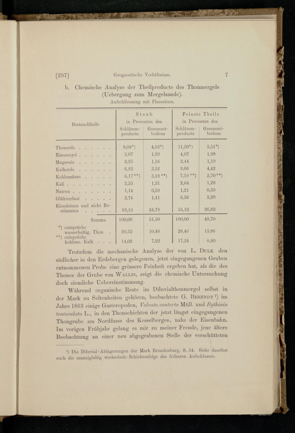 Aufschliessung mit Flusssäure. | Staub| Feinste Theile Bestandtheile in Procenten des in Procenten d« S 1 Gesammt- Schlämm- Gesammt| ıcts bodens products bodens — ı EN N Thonerde| 8,08 16| 11,30%) 5,51”) Eisenoxyd.. 2: 2,07 9| 4,07 1,98 Magn« 2,25 ‚16 1 2,44 1,19 Kalkerde 6,83 3,52. 9,06 4.42 Kohlensäure... GI) 3,1877)| 7,9947) SB 1077) | Kali A 2,53 ‚31| 2,64 1,28 Natron; 1 ie 1,14 0,59| 1,21 0,39 Glühverlust‘.., 1. 2,74 41| 6,56 3,20 Kieselsäure und nicht Be-|| stimmtes; 68,19 34,78| 55,13 26,83 FA EC(an Er Summa| 100,00 51,50 1 100,00 48,70 ) entspräche| wasserhaltig. Thon 1 920,33 10,48 28,46 13,86 entspräch«| kohlens. Kalk| 14,02 7,22 17,24 8,40