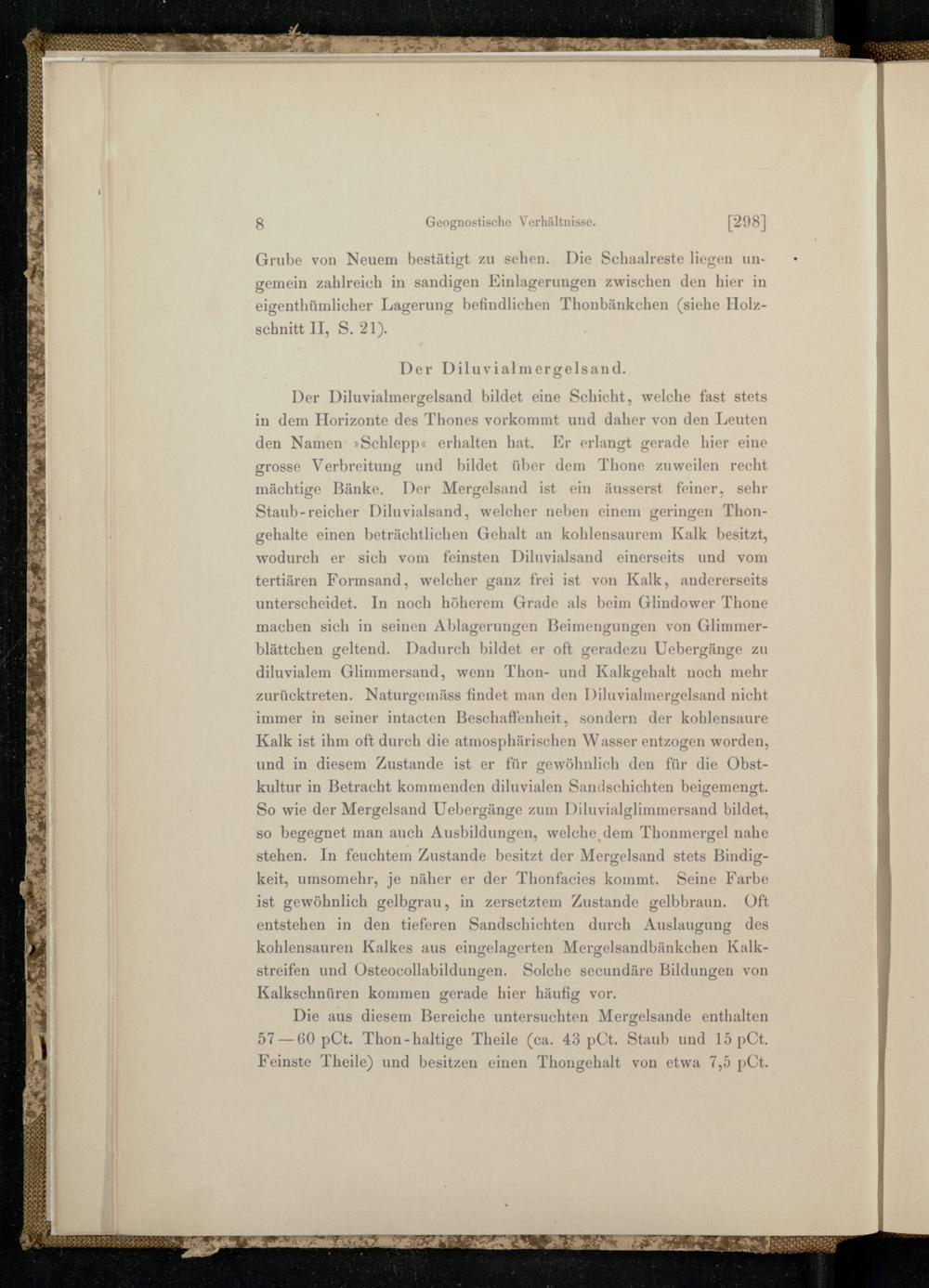 | fe schnitt II, S. 21) 4 Der Diluvialmergelsand. } Der Diluvialmergelsand bildet eine Schicht, welche fast stets 5 in dem Horizonte des Thones vorkommt und daher von den Leuten = den Namen:»Schlepp« erhalten hat. Er erlangt gerade hier eine . grosse Verbreitung und bildet über dem Thone zuweilen recht mächtige Bänke. Der Mergelsand ist ein äusserst feiner, sehr Staub-reicher Diluvialsand, welcher neben einem geringen ThonE gehalte einen beträchtlichen Gehalt an kohlensaurem Kalk besitzt, j wodurch er sich vom feinsten Diluvialsand einerseits und vom 1 tertiären Formsand, welcher ganz frei ist von Kalk, andererseits ne unterscheidet.. In noch höherem Grade als beim Glindower Thone | machen sich in seinen Ablagerungen Beimengungen von Glimmerx blättchen geltend. Dadurch bildet er oft geradezu Uebergänge zu L diluvialem Glimmersand, wenn Thon- und Kalkgehalt noch mehr P% zurücktreten. Naturgemäss findet man den Diluvialmergelsand nicht $ immer in seiner intacten Beschaffenheit, sondern der kohlensaure © Kalk ist ihm oft durch die atmosphärischen Wasser entzogen worden, Se und in diesem Zustande ist er für gewöhnlich den für die Obste kultur in Betracht kommenden diluvialen Sandschichten beigemengt. = So wie der Mergelsand Uebergänge zum Diluvialglimmersand bildet, A so begegnet man auch Ausbildungen, welche dem Thonmergel nahe stehen. In feuchtem Zustande besitzt der Mergelsand stets Bindig- 4 es keit, umsomehr, je näher er der Thonfacies kommt. Seine Farbe % ist gewöhnlich gelbgrau, in zersetztem Zustande gelbbraun. Oft | entstehen in den tieferen Sandschichten durch Auslaugung des j kohlensauren Kalkes aus eingelagerten Mergelsandbänkchen Kalk7 streifen und Östeocollabildungen. Solche secundäre Bildungen von A Kalkschnüren kommen gerade hier häufig vor. ® Die aus diesem Bereiche untersuchten Mergelsande enthalten 3 | 57—60 pCt. Thon-haltige Theile(ca. 43 pCt. Staub und 15 pCt. j | Feinste Theile) und besitzen einen Thongehalt von etwa 7,5 pCt.{ 5| 2 A