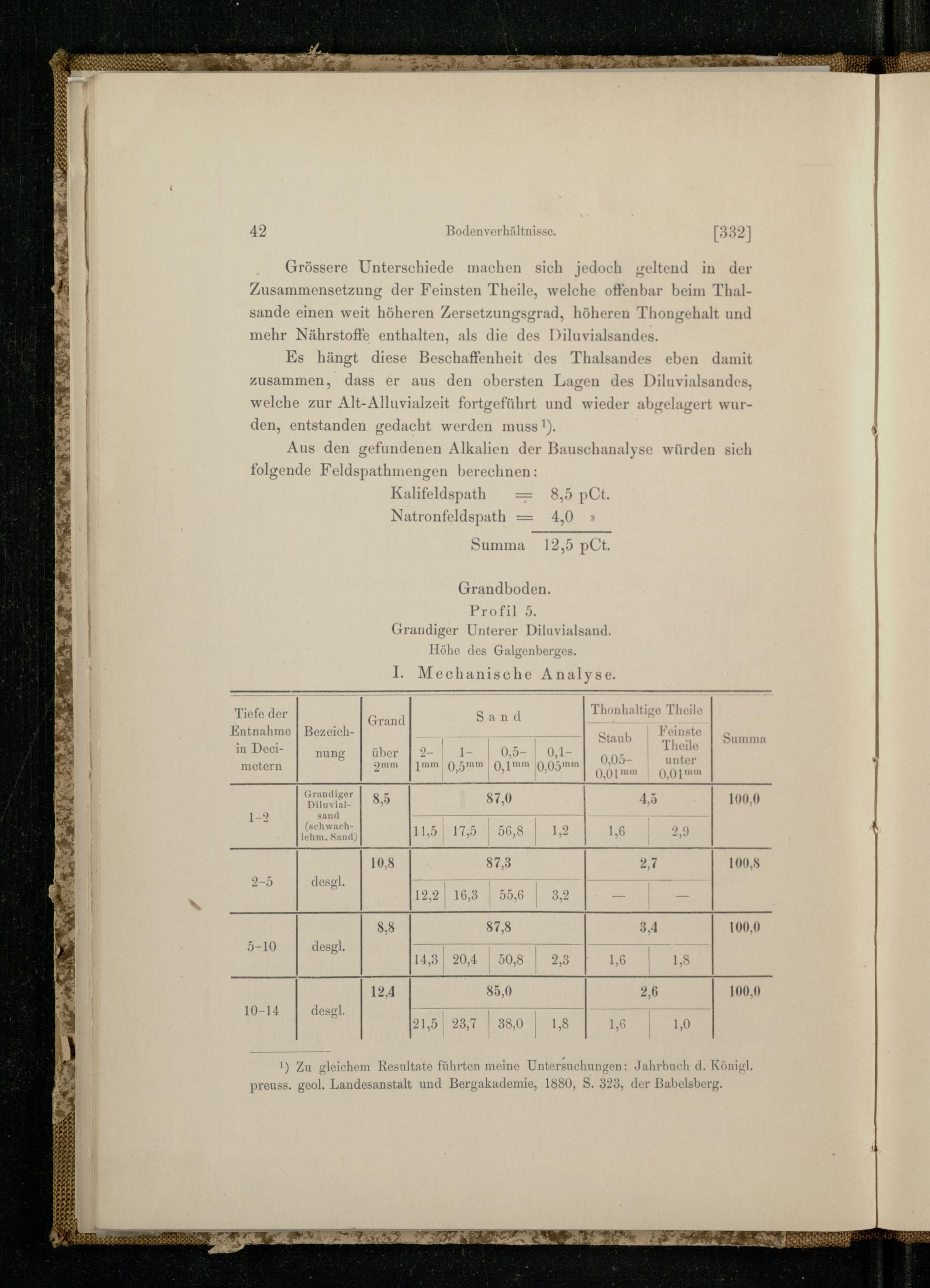 Grössere Unterschiede machen sich jedoch geltend in der Zusammensetzung der Feinsten Theile, welche offenbar beim Thalsande einen weit höheren Zersetzungsgrad, höheren Thongehalt und mehr Nährstoffe enthalten, als die des Diluvialsandes.