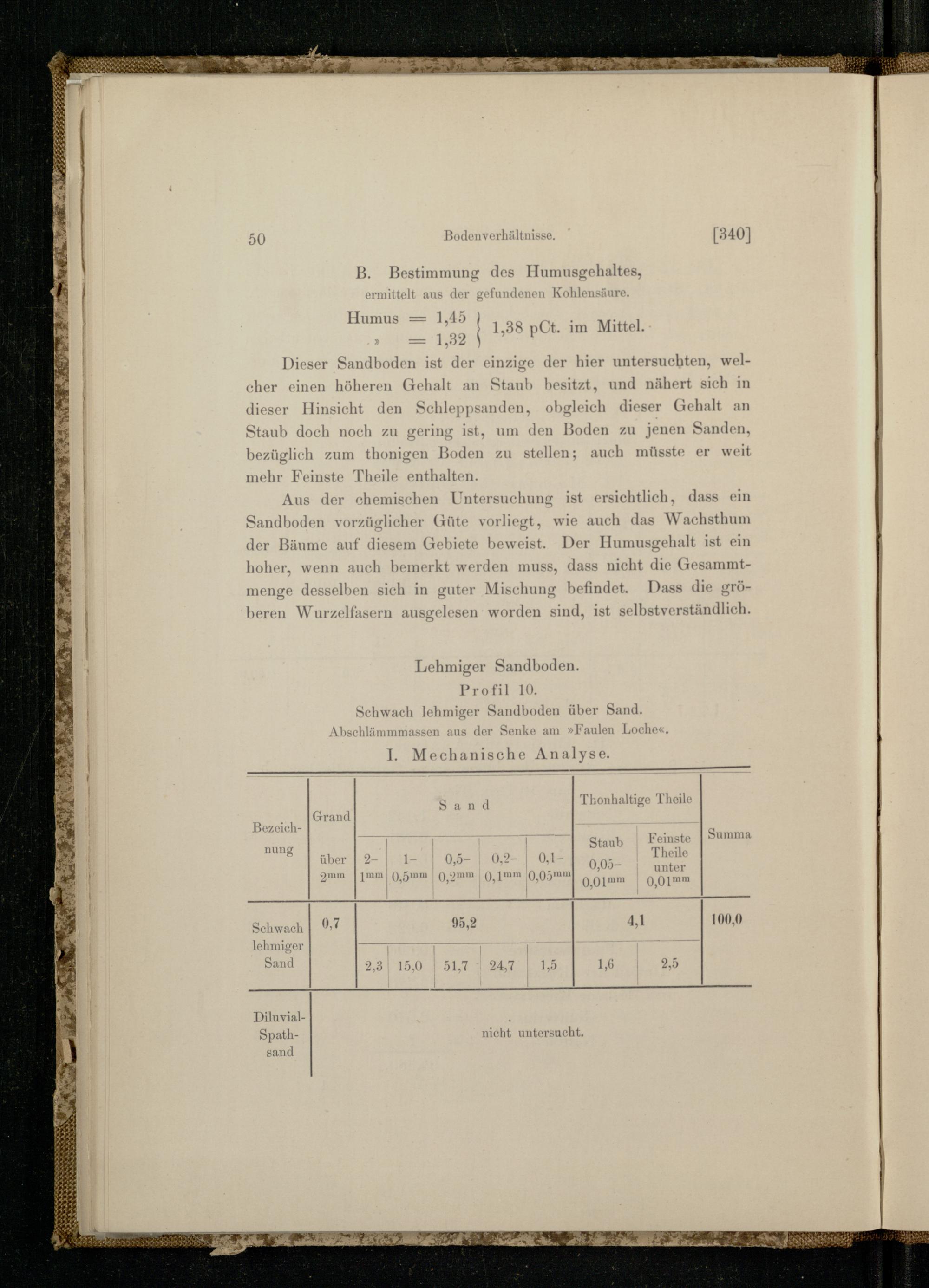Dieser Sandboden ist der einzige der hier untersuchten, wel­cher einen höheren Gehalt an Staub besitzt, und nähert sich in dieser Hinsicht den Schleppsanden, obgleich dieser Gehalt an Staub doch noch zu gering ist, um den Boden zu jenen Sanden, bezüglich zum thonigen Boden zu stellen; auch müsste er weit mehr Feinste Theile enthalten.