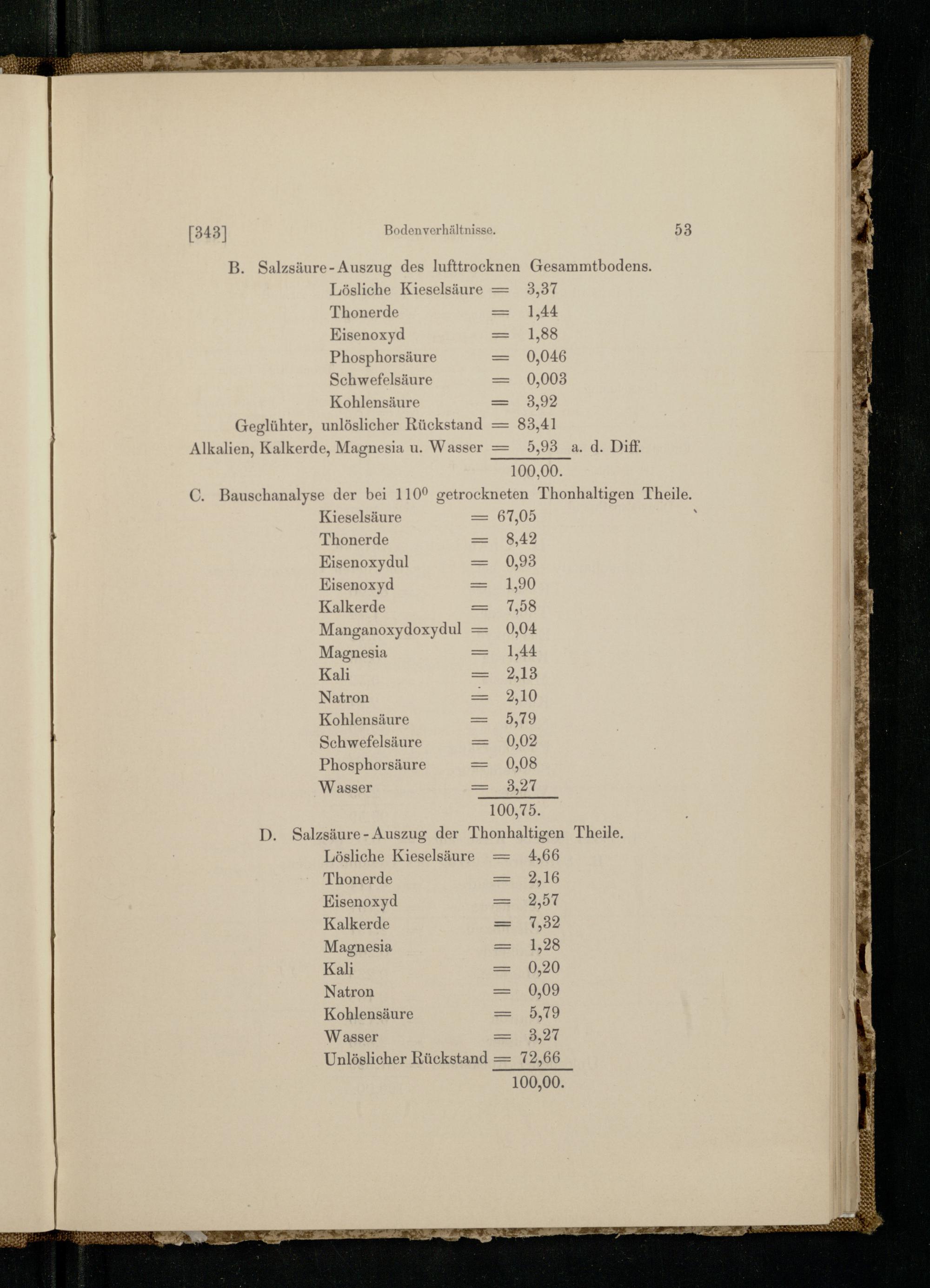 B. Salzsäure- Auszug des Ilufttrocknen Gesammtbodens. Lösliche Kieselsäure= 3,37 Thonerde 1,44 Eisenoxyd 1,88 Phosphorsäure 0,046 Schwefelsäure 0,003 Kohlensäure 8,92 Geglühter, unlöslicher Rückstand 83,41 Alkalien, Kalkerde, Magnesia u. Wasser= 5,93 a. d. Diff. 100,00. Bauschanalyse der bei 110° getrockneten Thonhaltigen Theile. Kieselsäure Thonerde Eisenoxydul Eisenoxyd Kalkerde Manganoxydoxydul= 0,04 Magnesia= 1,44 Kali 2,13 Natron= 2,10 Kohlensäure 5,79 Schwefelsäure 0,02 Phosphorsäure== 0,08 Wasser= 3,27 100.75. D. Salzsäure- Auszug der Thonhaltigen Theile. Lösliche Kieselsäure= 4,66 Thonerde 2,16 Eisenoxyd 2,57 Kalkerde 7,32 Magnesia 1,28 Kali 0,20 Natron 0,09 Kohlensäure 5,79 W asser== 13,27