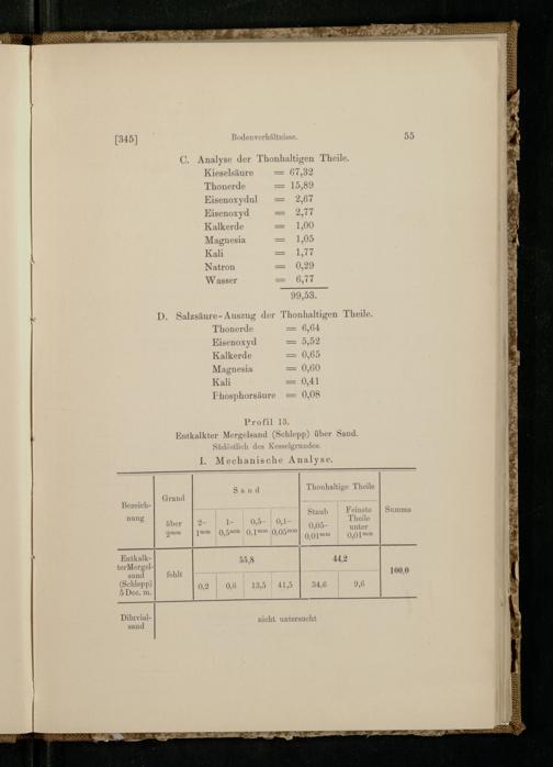 [345] Bodenverhältnisse 55 C. Analyse der Thonhaltigen Theile. Kieselsäure== 67,82 Thonerde= 15,89 Eisenoxydul== 2,67 Eisenoxyd= 2,747 Kalkerde— 1,00 Magnesia— 1,05 Kali== 1,77 Natron= 0,29 W asser== 6,77