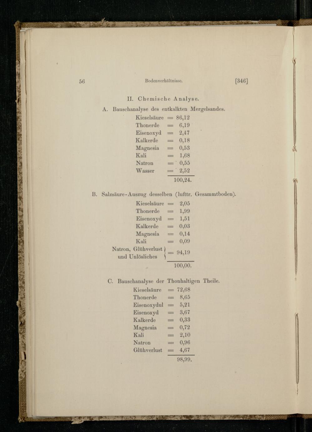 Kieselsäure= 86,12 Thonerde= 6,19 Eisenoxyd= 2,47 Kalkerde= 0,18 Magnesia.— 0,53© Kali== 1,68 Natron=" 0,55 Wasser= 2,52 100,24 G \ B. Salzsäure- Auszug desselben(lufttr, Gesammtboden). Kieselsäure= 2,05 Thonerde=— 1,99| Eisenoxyd= 1,51| Kalkerde= 0,03 Magnesia= 0,14 Kali= 0,09