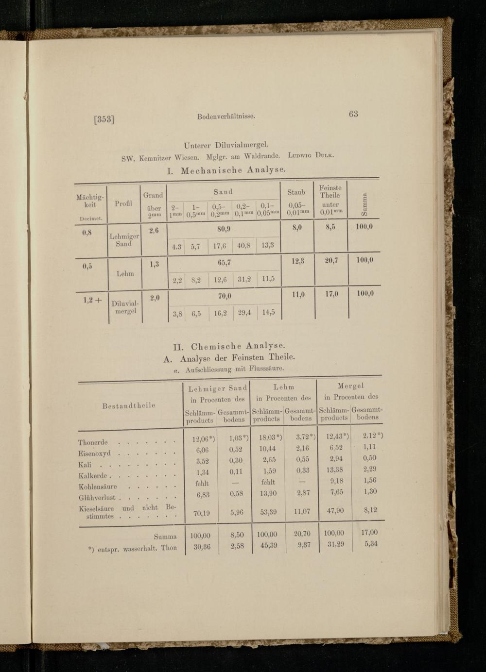 Thonerde 12,06% 1,08*)1 18,03*) 9.72% 12.43* Eisenoxyd 6,06 0,52 10,44 2,16 6.52 Kali 352 0,30 2,65 0,55 92.94 Kalkerde 1,34 0,11 1,59 0,33 13,98 Kohlensäure EN fehlt fehlt= 9,18 Glühverlust.:; 1.0.00 He 6,83 0,58 13,90 2,87 7,65 Kieselsäure und nicht Bestimmtes 70,19 3,96 53,39 11,07 47,90 LE Summa 100,00 ‚50 100,00),70 100,00 *) entspr. wasserh: alt. Thon 30,36 2,58 45,39 31,29 N SE EEE EEE a BE