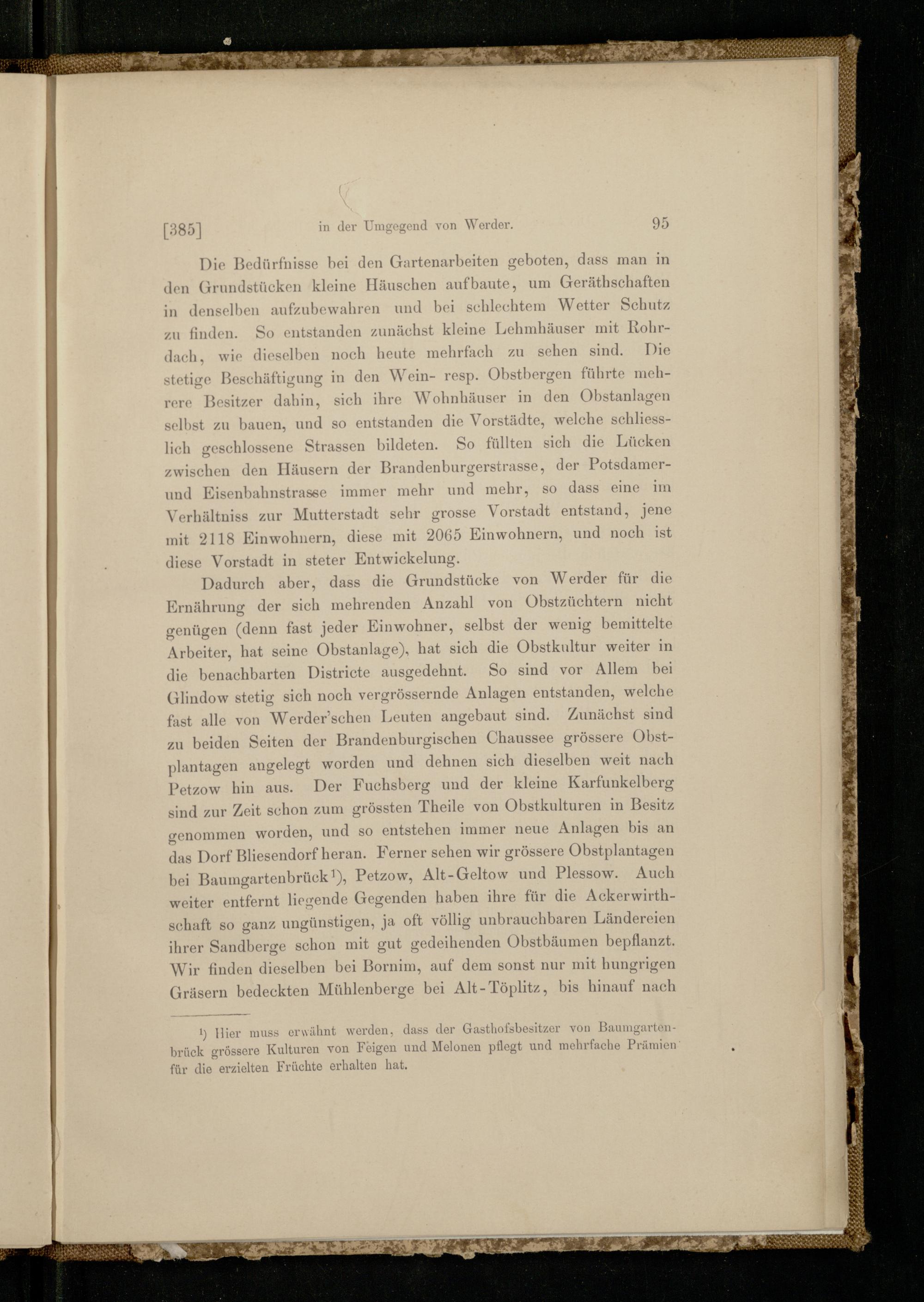 genommen worden, und so entstehen immer neue Anlagen bis an das Dorf Bliesendorf heran. Ferner sehen wir grössere Obstplantagen bei Baumgartenbrück*), Petzow, Alt-Geltow und Plessow. Auch weiter entfernt liegende Gegenden haben ihre für die Ackerwirthschaft so ganz ungünstigen, ja oft völlig unbrauchbaren Ländereien