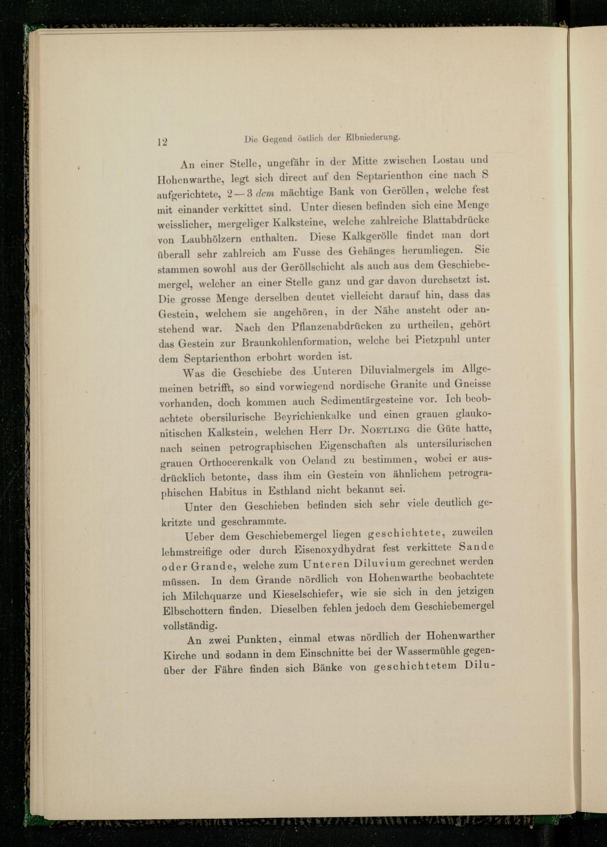 An einer Stelle, ungefähr in der Mitte zwischen Lostau und Hohenwarthe, legt sich direct auf den Septarienthon eine nach aufgerichtete, 2- 3 dem mächtige Bank von Geröllen, welche fest mit einander verkittet sind. Unter diesen befinden sich eine Menge weisslicher, mergeliger Kalksteine, welche zahlreiche Blattabdrücke von Laubhölzern enthalten. Diese Kalkyerölle findet man dort überall sehr zahlreich am Fusse des Gehänges herumliegen. Sie stammen sowohl aus der Geröllschicht als auch aus dem Geschiebemergel, welcher an einer Stelle ganz und gar davon durchsetzt ist. Die grosse Menge derselben deutet vielleicht darauf hin, dass das Gestein, welchem sie angehören, in der Nähe ansteht oder anstehend war. Nach den Pflanzenabdrücken zu urtheilen, gehört das Gestein zur Braunkohlenformation, welche bei Pietzpuhl unter dem Septarienthon erbohrt worden ist.